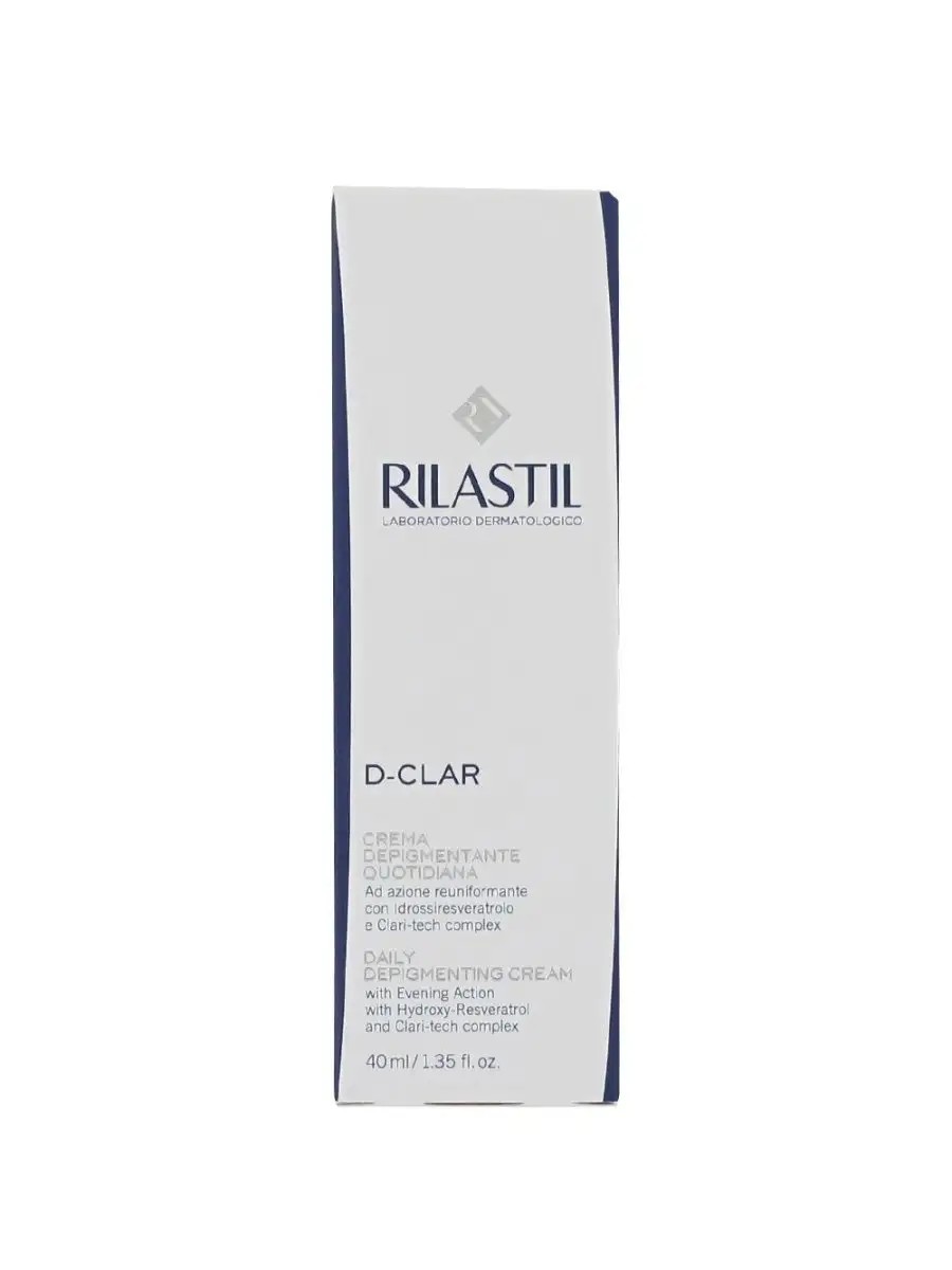 Rilastil D-Clar Daily Depigmenting Cream reduces all types of hyperpigmentation: chloasma, melasma, drug-induced pigmentation, post-acne, and sun exposure. The cream makes age spots less visible, evens out complexion, gives the skin a radiant appearance, restores elasticity, and moisturizes. Suitable for all skin types, including sensitive skin. This cream combats post-acne pigmentation, cleanses and evens out skin tone. Contains the CLARI-TECH complex. Reduces hyperchromia, sun spots, melasma, drug-induced or post-acne hyperpigmentation, and corrects a dull, uneven complexion. For all skin types, including very sensitive skin. Action: Care for the skin of the face, décolleté, and hands. ##### Directions: Apply morning and evening to cleansed skin.