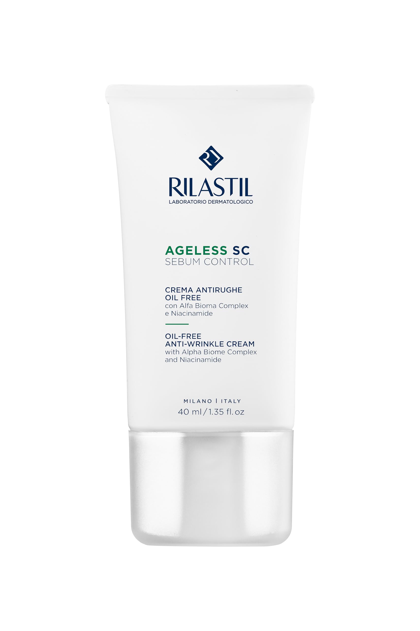 Face Cream Minimizes the appearance of wrinkles, smooths and hydrates. Combines a sebum-regulating effect with specific pro-skin microbiota active ingredients, thanks to the unique Alfa Bioma Complex . Enriched with niacinamide and menthyl PCA, it mattifies and provides a feeling of freshness. Suitable for mature, combination, and oily skin. Alphalphalphane extract and a multi-active system that combines Lactobacillus Ferment, Niacinamide, and Salicylic Acid. INGREDIENTS Aqua (Water), C15-19 Alkane, Glycerin, Niacinamide, Triethylhexanoin, C14-22 Alcohols, Polyacrylate Crosspolymer-6, Menthyl PCA, Silica, Panthenol, Tocopheryl Acetate, C12-20 Alkyl Glucoside, Phosphatidylcholine, Sodium Hyaluronate. Polygluate, sodium tamate, ethyl linolenate, medicago sativa (alfalfa) seed extract, ethyl oleate, lactobacillus ferment, lactic acid, ethyl linoleate, salicylic acid, tocopherol, phytic acid, beta-sitosterol, squalene, chlorphenesin, butylene glycol, O-Cymen-5-Ol, Men-5-Ol, Men-5-Ol, Men-5-Ol, Men-5-Ol, Men-5-Ol, Men-5-Thol, Parfum (Random Fragrance). DIRECTIONS Apply morning and evening to the face, neck, and décolleté after Ageless SC Serum. SAFETY WARNING Dermatologically tested, non-comedogenic, clinically tested, oil-free. Tested for nickel, cobalt, chromium, palladium, and mercury (each less than one part per million. Small amounts may cause skin sensitization). See moreDirections: Apply morning and evening to the face, neck, and décolleté after Ageless SC Serum. For mature, combination, and oily skin. Formulated with the exclusive Alfa Bioma Complex (alphalfa extract and a multi-active system combining Lactobacillus Ferment, Niacinamide, and Salicylic Acid), Niacinamide, and Menthyl PCA. Minimizes the appearance of wrinkles, smooths, and hydrates. AGELESS SC SEBUM CONTROL Oil-Free Anti-Wrinkle Face Cream.Rilastil Ageless SC Sebum Control Crème anti-rides sans huile avec Alfa Bioma Complex et Niacinamide 40 mlDESCRIPTION DU PRODUIT DESCRIPTION DU PRODUIT Crème visage Minimise la visibilité des rides, lisse et hydrate Associe à l'effet sébonormalisant actifs spécifiques pro microbiote cutané, grâce à l'unique Alfa Bioma Complex . Enrichi en niacinamide et menthyl PCA, matifie et procure une sensation de fraîcheur. Convient aux peaux matures, mixtes et grasses. Extrait d'alphalphalphane et un système multi-actif qui combine Lactobacillus Ferment, Niacinamide et Acide salicylique INGRÉDIENTS Aqua (Water), C15-19 Alkane, Glycerin, Niacinamide, Triethylhexanoin, C14-22 Alcohols, Polyacrylate Crosspolymer-6, Menthyl PCA, Silica, Panthenol, Tocopheryl Acétate C12-20 Alkyl Glucoside, Phosphatidylcholine, Sodium Hyalurono. Polygluate, sodium tamate, éthyl linolenate, medicago sativa (alfalfa) seed extract, éthyl oléate, lactobacillus ferment, lactic acid, éthyl linoléate, acide salicylique, tocopherol, acide phytique, béta-Sitosterol, squalène, chlorphenesin, butylene glycol, O-Cymen-5-Ol, Men-5-Ol, Men-5-5-Ol, Men-5-Ol, Men-5-Ol, Men-5-5-Ol, Men-5-Thol Parfum (Fragrague rance). MODE D'EMPLOI Appliquer matin et soir sur le visage, le cou et le décolleté après Ageless SC Sérum. AVERTISSEMENT DE SÉCURITÉ Testé dermatologiquement, non comédogène, testé cliniquement, sans huile. Testé pour Nickel, Cobalt, Chrome, Palladium et Mercure (chacun inférieur à une partie par million. De petites quantités peuvent être responsables de la sensibilisation cutanée). Voir plusMode d'emploi : appliquer matin et soir sur le visage, le cou et le décolleté après Ageless SC Sérum. Peau mature, mixte et grasse. Formule avec l'exclusif Alfa Bioma Complex (extrait d'alphalfa et un système multi-actif qui combine Lactobacillus Ferment, Niacinamide et acide salicylique), Niacinamide et Menthyl PCA. Action minimise la visibilité des rides, lisse et hydrate. AGELESS SC SEBUM CONTROL Crème visage anti-rides sans huile.