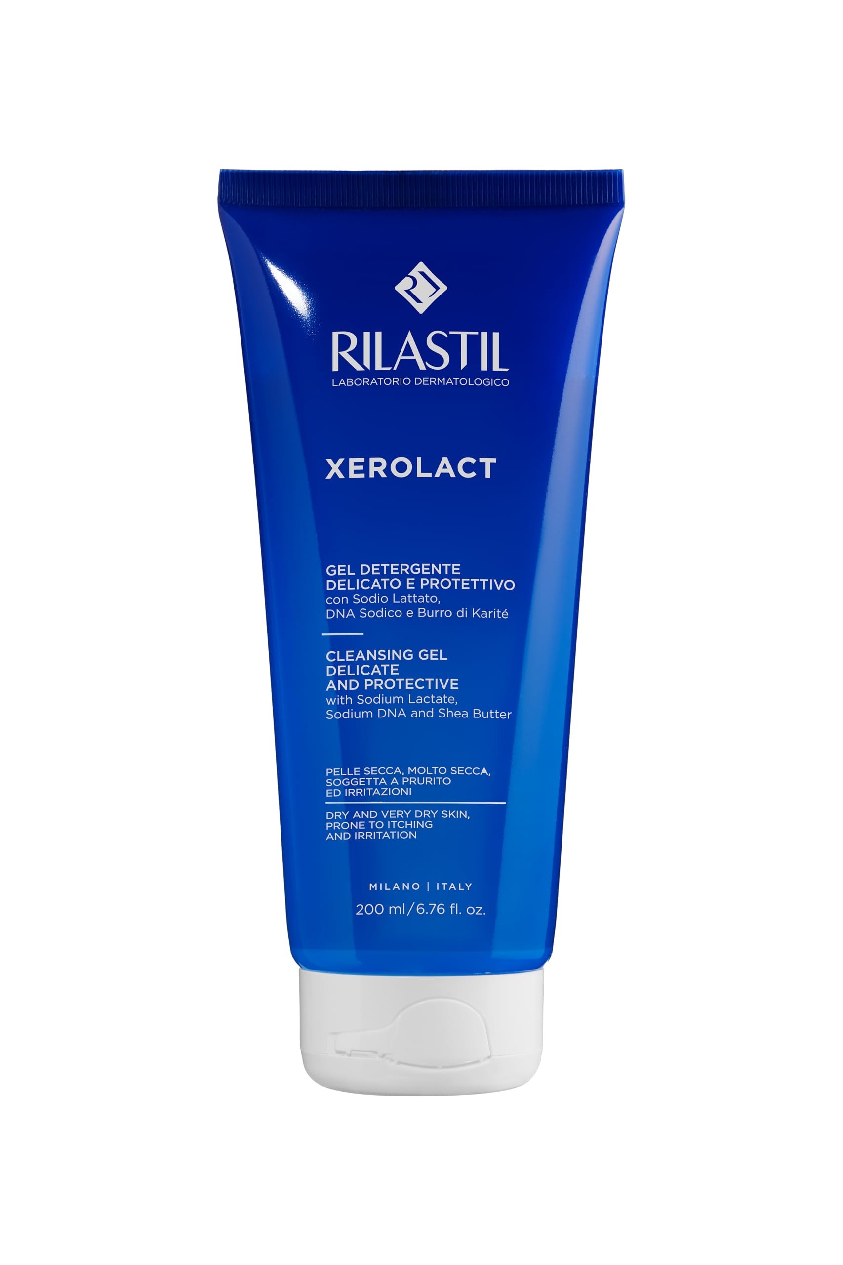 Protective barrier action treatment. Soothes and strengthens the skin barrier. For the face and body of newborns, children and adults.Soin à action barrière protectrice. Apaise et renforce la barrière cutanée. Pour le visage et le corps des nouveau-nés, enfants et adultes.Rilastil Xerolact Gel nettoyant doux et protecteur pour le corps, 200 ml
