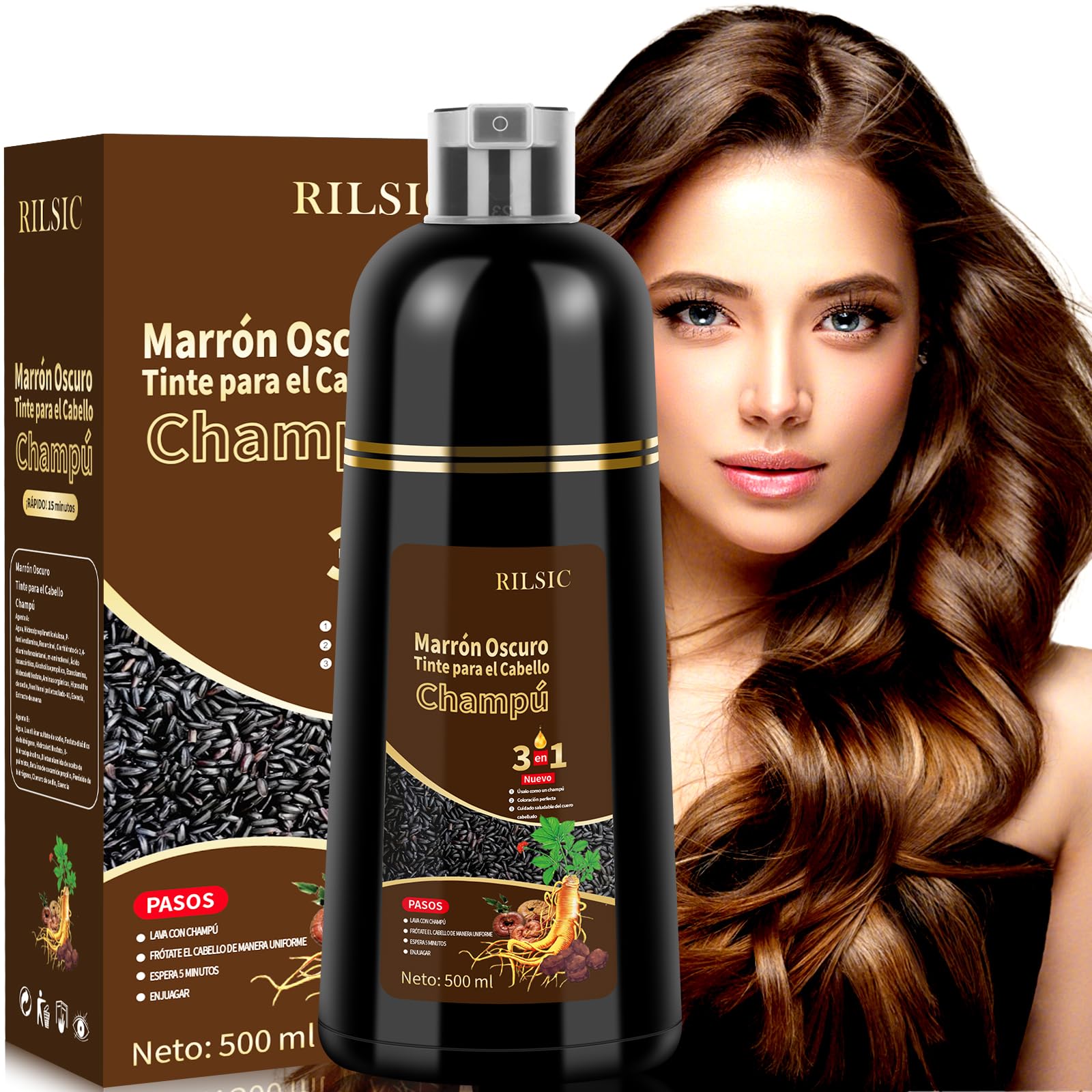 500 ml 3-in-1 Hair Dye Shampoo, Instant Hair Color Shampoo, Hair Dye, Natural Color, Long-Lasting, Shampoo for Colored Hair for Men and Women INGREDIENTS 3-in-1 Hair Dye Shampoo INSTRUCTIONS Perform a patch test before first use. Wear gloves and apply the color shampoo to dry hair. Distribute evenly for a few minutes to cover gray hair. Leave on for 10 to 25 minutes. Rinse thoroughly with water. SAFETY WARNING If using for the first time, be sure to perform a patch test. Do not get into eyes. See moreSave Time and Money Say Goodbye to Gray Hair! Whether for your hair, beard, or targeted touch-ups: our hair color instantly covers gray hair for a younger, more handsome look. Enjoy a rejuvenated appearance! Professional results right at home. No more salon visits, no more expensive trips to the hairdresser. Save time and money! 3-in-1 Color Shampoo for Gray Hair: More than just a dye, it's also a shampoo and conditioner. Instantly covers gray hair and restores a long-lasting, intense black. Easy to use, you can color your hair comfortably at home. Say goodbye to gray hair! Directions: 1. Perform a patch test before first use. 2. Wear gloves and apply the color shampoo to dry hair. 3. Distribute evenly for a few minutes to cover the gray hair. 4. Leave on for 10 to 25 minutes. 5. Rinse thoroughly with water. Instantly achieve natural, shiny black hair! 3-in-1 Coloring Shampoo: Hair color for women and men, enriched with natural plant extracts that protect the hair fiber and ensure a natural shade. Effectively repairs hair, leaving it shiny, soft, and manageable. The color adheres easily to the hair surface, more safely and without damage. Covers 100 of Gray Hair: RILSIC Coloring Shampoo. Are gray hairs still bothering you? Get rid of them in just 10 to 15 minutes! Our coloring shampoo effectively covers gray hair to instantly restore a natural black color. Lasts for 4 to 5 weeks.500 ml Hair Dye Shampoo 3 en 1, Shampooing Colorant Instantanée pour Cheveux, Teinture Cheveux, Naturelle Couleur Naturelle, Longue Durée, Shampoing Cheveux Colorés pour Hommes Femmes (Chatain Foncé) Chatain Foncé 500 ml (Paquete de 1)DESCRIPTION DU PRODUIT DESCRIPTION DU PRODUIT 500 ml Hair Dye Shampoo 3 en 1, Shampooing Colorant Instantanée pour Cheveux, Teinture Cheveux, Naturelle Couleur Naturelle, Longue Durée, Shampoing Cheveux Colorés pour Hommes Femmes INGRÉDIENTS Hair Dye Shampoo 3 en 1 MODE D'EMPLOI Effectuer un test cutané avant la première utilisation. Porter des gants et appliquer le shampooing colorant sur cheveux secs. Répartir uniformément pendant quelques minutes pour couvrir les cheveux blancs. Laisser agir 10 à 25 minutes. Rincer abondamment à l'eau. AVERTISSEMENT DE SÉCURITÉ Si vous l'utilisez pour la première fois, assurez-vous de faire un test cutané. Ne pas mettre en contact avec les yeux Voir plusÉconomisez Temps et Argent Dites Adieu aux Cheveux Blancs ! Que ce soit pour les cheveux, la barbe ou des retouches ciblées : notre colorant couvre instantanément les cheveux blancs pour un look plus jeune et plus beau. Profitez d'une nouvelle apparence rajeunie ! Résultat professionnel directement chez vous. Plus besoin de salon, finies les séances coûteuses chez le coiffeur. Économisez temps et argent !. Shampooing Colorant 3 en 1 pour Cheveux Blancs : Plus qu'une simple teinture, c'est aussi un shampooing et un après-shampooing. Couvre instantanément les cheveux blancs et restaure durablement un noir intense. Facile à utiliser, vous pouvez vous colorer les cheveux confortablement chez vous. Dites adieu aux cheveux blancs !. Mode d'emploi : 1. Effectuez un test cutané avant la première utilisation. 2. Portez des gants et appliquez le shampooing colorant sur cheveux secs. 3. Répartissez uniformément pendant quelques minutes pour couvrir les cheveux blancs. 4. Laissez agir 10 à 25 minutes. 5. Rincez abondamment à l'eau. Obtenez immédiatement des cheveux noirs naturels et brillants!. Shampooing Colorant 3 en 1: Colorant capillaire pour femmes et hommes, enrichi d'extraits de plantes naturelles qui protègent la fibre capillaire et assurent une nuance naturelle. Répare efficacement les cheveux, leur apportant brillance, douceur et fluidité. Le colorant adhère simplement à la surface du cheveu, de manière plus sûre et sans dommage. Couvre 100 des Cheveux Blancs : RILSIC Shampooing Colorant, Les cheveux blancs vous dérangent encore ? Libérez-vous-en en seulement 10 à 15 minutes ! Notre shampooing colorant couvre efficacement les cheveux blancs pour redonner instantanément une couleur noire naturelle. Résultat durable pendant 4 à 5 semaines.