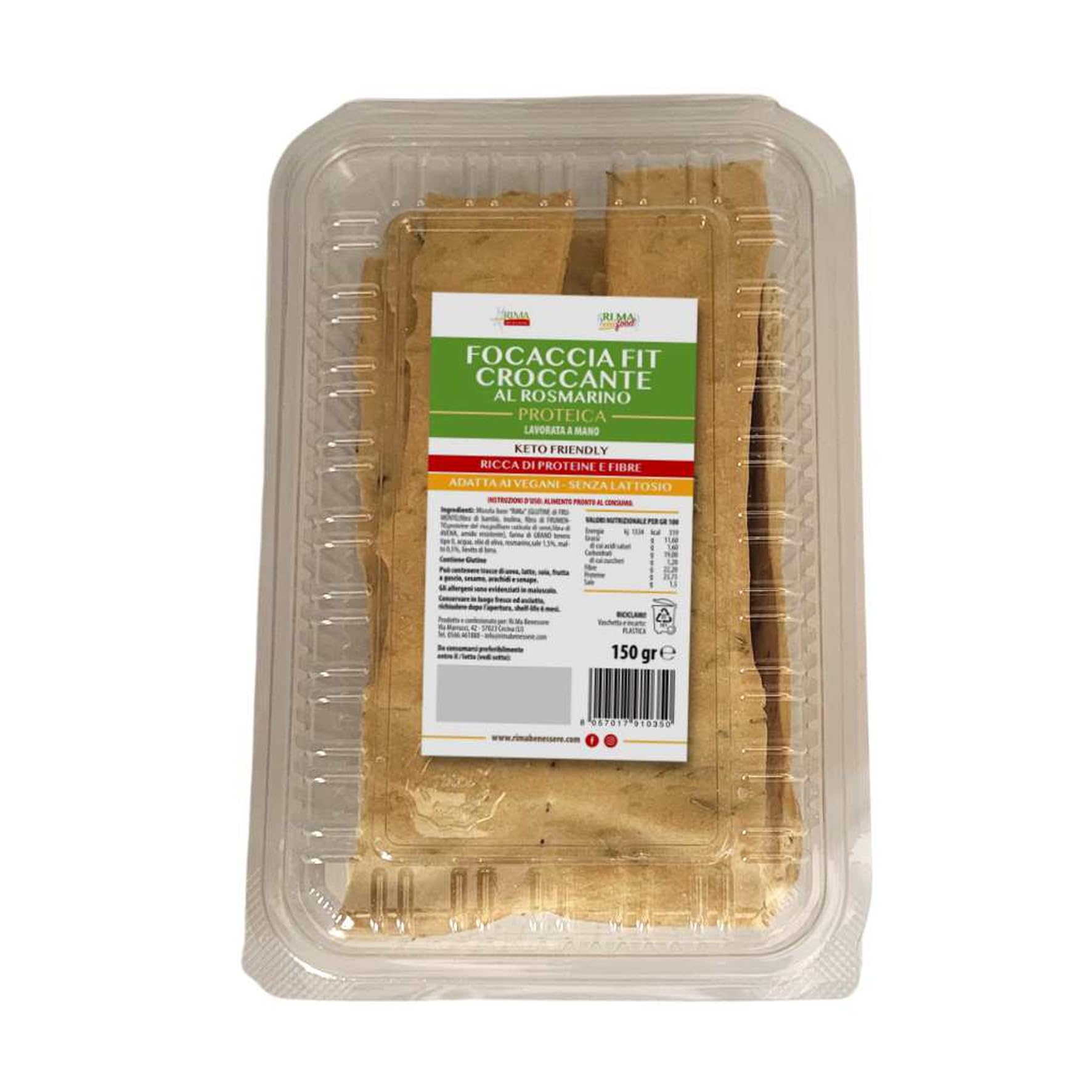 Crispy low-carb protein focaccia: low in calories, low in carbohydrates, low glycemic index, lactose-free, ideal for vegan diets, source of omega-3 fatty acids, phosphorus, and calcium. High in protein. 150g size.