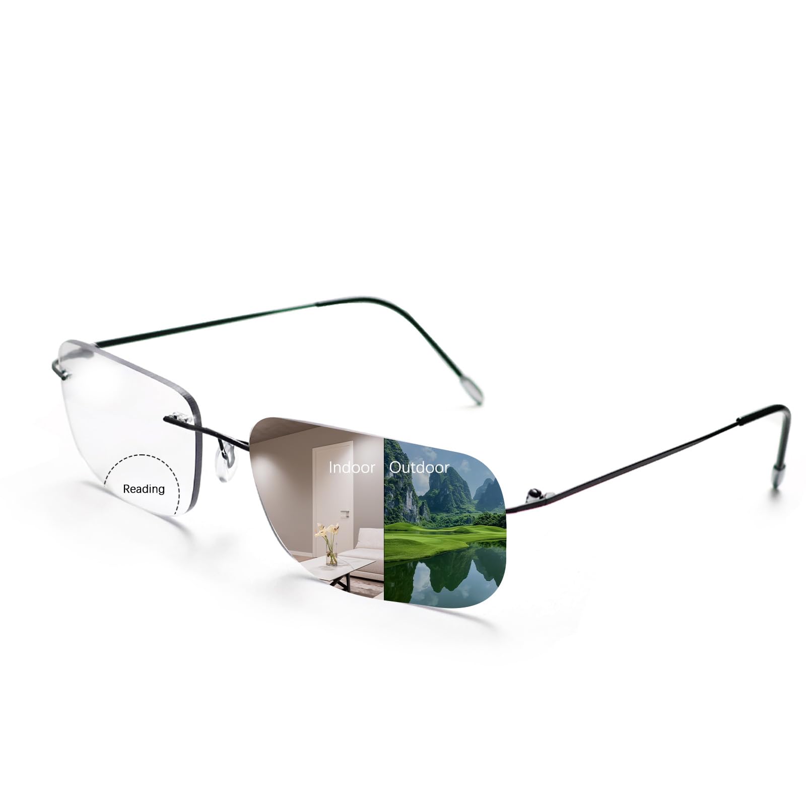 ??Your Package?1*Progressive Photochromic Bifocal Reading Glasses/1*Glasses Case/1*Microfiber Cleaning Cloth.It can be a great choice as a gift for your family or friends.If you have any questions about the photochromic multifocal reading glasses,please contact our customer service to answer your questions and provide satisfactory solutions.Make your choice more assured and give a more thoughtful gift. ??Reading Glasses Size?Photochromic bifocal reading glasses offer 6 different intensity options to meet different vision needs. (1.0, 1.5, 2.0, 2.5, 3.0, 3.5).total width 140mm (5.51in),lens width 56 mm (2.20 in),lens height 35mm (1.37in),bridge width 18mm (0.70in),arm length 133mm(5.23in). Only 15g.You can enjoy clear vision while feeling a burden-free wearing experience. ??Rimless Reading Glasses?The perfect combination of rimless rectangular frame and wear-resistant metal hinges not only shows the fashionable and simple style,but also ensures the long-lasting durability of the product.Resin lenses with anti-scratch and wear-resistant performance guard your clear vision.Every detail is an insistence on quality,allowing you to enjoy a burden-free visual feast in every moment. ??Blue Light Blocking Reading Glasses?Anti-blue light technology,as a key means of modern eye care,people face the screen for a long time,easy to cause dry eyes,blurred vision and other problems,effectively blocking the blue light infringement,providing a clearer vision and comfortable experience,reducing the damage and discomfort to the eyes.Ensure that we can maintain the best vision and comfort in the digital world. ??Photochromic Bifocal Reading Glasses?Photochromic Bifocal reading glasses can adjust the lens color according to the light intensity to protect your eyes from UV rays.Bifocal technology,blending near and far view without switching,opens up a clear vision without boundaries for you.No need to change glasses frequently,which reduces the burden of carrying and also improves the convenience and comfort of use.
