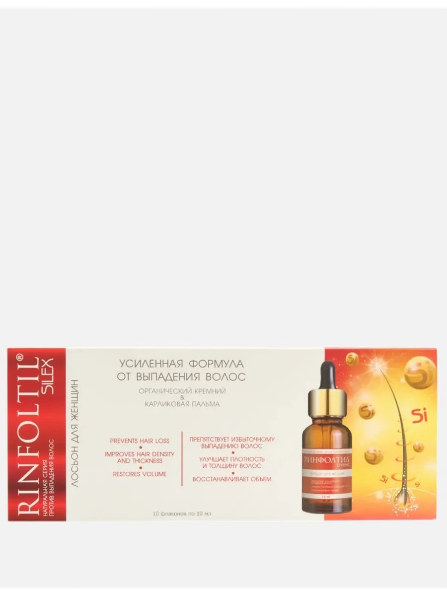 Ринфолтил силекс усиленная формула от выпадения волос с кремнием лосьон для женщин 10 флаконов 10 мл рекомендуется: для тонких и ломких волос, для укрепления волос, против выпадения волос. При регулярном применении натуральное и эффективное средство против выпадения волос ринфолтил препятствует избыточному выпадению волос, улучшает плотность и толщину волос, восстанавливает густоту и объем. Лосьон для волос ринфолтил силекс для женщин разработан против выпадения и для роста волос. Действие лосьона направлено на увеличение толщины и плотности волос, восстановление объема, решение проблемы избыточного выпадения волос. Средство от выпадения волос rinfoltil silex рекомендуется для тонких и ломких волос, для укрепления волос, против выпадения волос.