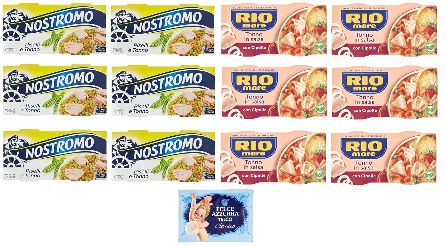 Rio Mare Pack of 12 Tuna and Onion Test Sachets + Nostromo Tuna and Peas 2 x 150 g + 1 Felce Azzurra Talc Sachet 100 g