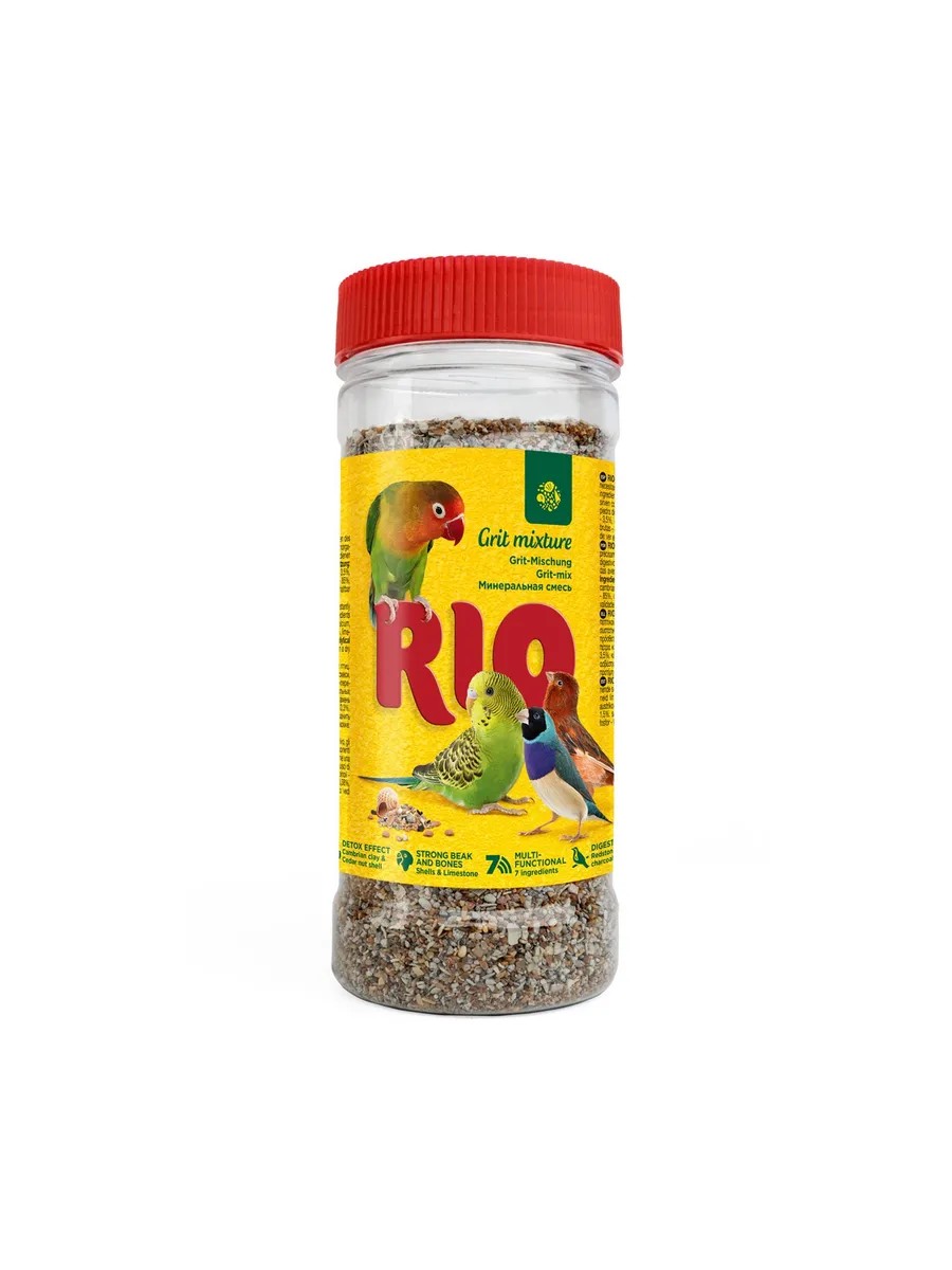 In addition to their main food, birds require a constant supply of minerals in their cage due to the unique digestive system of birds. The Rio mineral mixture contains inorganic and organic components that act as gastroliths, helping to grind hard seeds in the birds' gizzard. The Rio mineral mixture also serves as an additional source of calcium, phosphorus, sodium, and other minerals. Shell rock is an important source of calcium, phosphorus, sodium, and other minerals. Shell rock dissolves in the acidic environment of the gizzard, and the resulting mineral salts are easily absorbed by the bird's body. Shell rock is especially necessary during the nesting period for the formation of strong eggshells, as well as for maintaining healthy bones and beaks in chicks and adult birds. White rock is obtained by crushing and then drying limestone. White rock is rich in substances that maintain the water-salt balance in the bird's body and also promote bone growth. Red stone normalizes gastrointestinal function in birds. Regular use promotes good fecal consistency. Crushed Cambrian clay is essential for birds to remove accumulated toxins from their bodies. Additionally, the clay contains clay minerals, organic compounds, iron oxides, and other beneficial substances. Crushed pine nut shells contain many valuable macro- and microelements. They have adsorbent properties and have astringent, antimicrobial, and anti-inflammatory properties. Charcoal regulates stomach acidity in birds and is effective in preventing gastrointestinal disorders. This product is certified. Dear customers! Please note that packaging may have several designs. Delivery is subject to stock availability. Ingredients: sea stone and oyster shells, white stone, red stone, Cambrian clay, pine nut shells, charcoal.