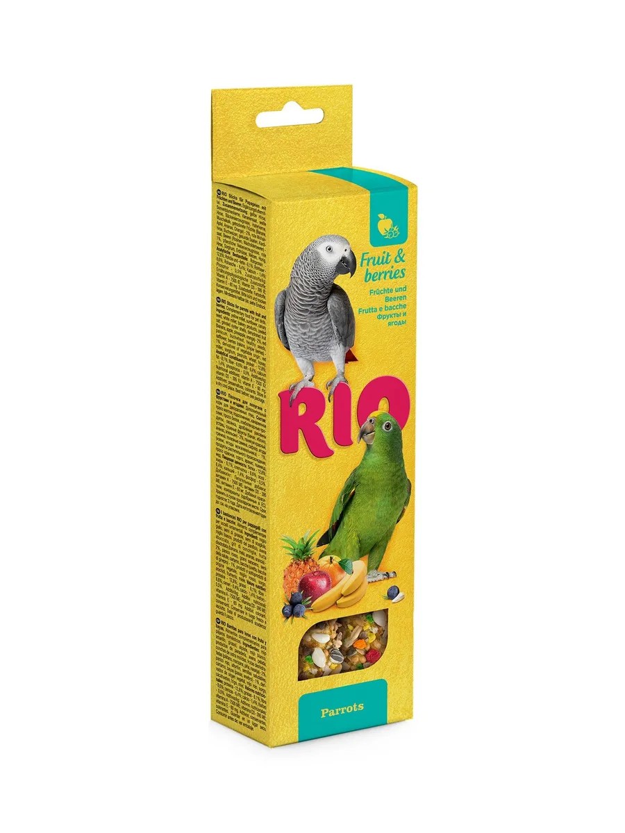 Fruit and berry sticks for parrots contain selected ingredients and help diversify your pet's diet. RIO sticks are especially large for larger parrots. To achieve a crispy texture, the sticks are baked in ovens using a gentle baking technology that preserves all the beneficial properties of the product. The base of the treat is a beechwood rod, which is an excellent tool for filing down the beak. These sticks will keep your pet occupied for a long time and are also a convenient tool for play and training. Ingredients: yellow millet, sunflower, canary seed, white millet, bakery products, oatmeal, crushed oyster shells, dried fruits (banana, apple, pineapple, orange), red panicum, buckwheat, healthy seeds, safflower, berries (raisins, juniper berries), plant products, red millet, sorghum, peanuts, wheat, inulin.