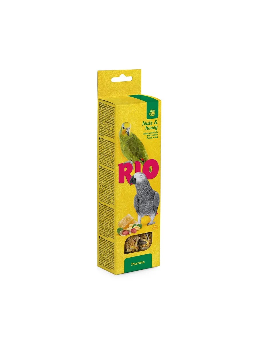 Parrot sticks with nuts and honey contain select ingredients and help diversify your pet's diet. RIO sticks are especially large for the convenience of larger parrots. To achieve a crispy consistency, the sticks are baked in ovens using a gentle baking technology, which preserves all the beneficial properties of the product. The base of the treat is a beech rod, which is an excellent tool for filing the beak. These sticks will keep your pet busy for a long time and are also a convenient tool for play and training. Ingredients: sunflower, white millet, canary seed, yellow millet, bakery products, oatmeal, buckwheat, healthy seeds, safflower, peanuts, plant products, sorghum, red panicum, honey, red millet, wheat, berries (raisins, juniper berries), dried fruits (apple, banana), inulin.