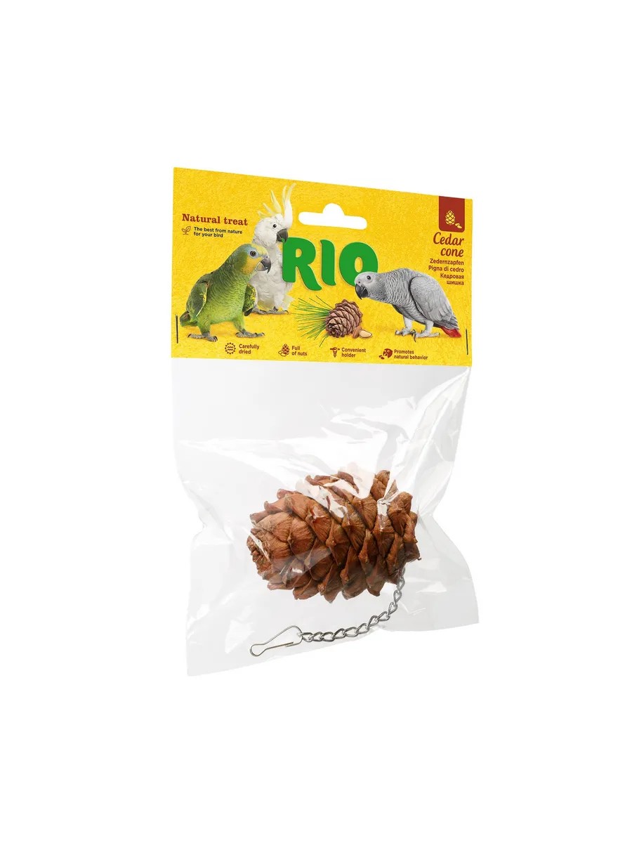 RIO cones undergo special processing. This is carried out in order to reduce the resin content. This is important, as resin can be harmful to birds, causing irritation and impeding digestion. Natural bird treats can promote their physical and mental well-being, strengthen their immune system, and improve their mood. They are non-toxic and harmless to pets, humans, and the environment. Ingredients: cedar cone, metal fastener.