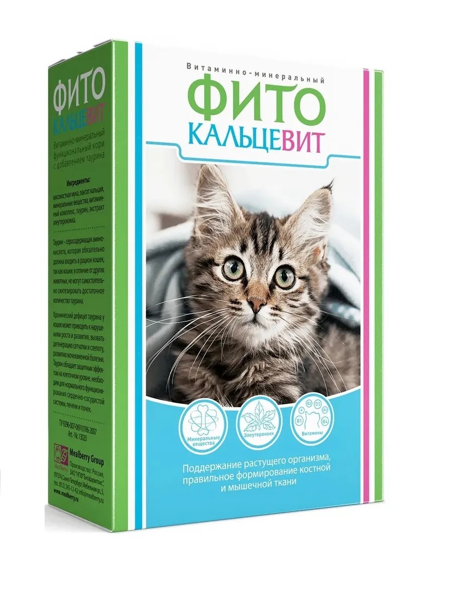 Витаминно-минеральный функциональный корм для кошек. Ежедневное применение Фитокальцевита исключает появление неблагоприятных последствий при несбалансированном питании. Необходим для правильного развития котят и поддержания здоровья взрослых животных. Повышает устойчивость организма к инфекционным заболеваниям.