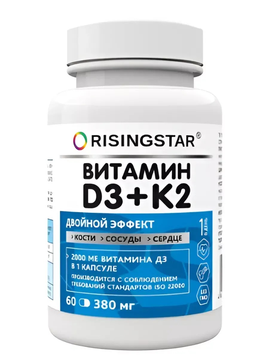 Risingstar витамин d3+k2 - Комплекс для ускорения процесса регенерации костной ткани при переломах и снижении риска развития остеопороза костей. Внешний вид: Желатиновые капсулы золотистого цвета.