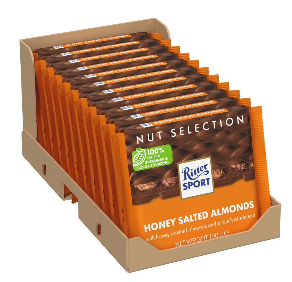 A SQUARE BAR: It was Clara Ritter who proposed it: "Let's make a chocolate that fits in any sports jacket pocket without breaking and has the same weight as a regular long bar." And so began the "Ritter Sport" saga. OUR STORY: For over 100 years, we have been writing the history of chocolate. The first stone of the Ritter Sport chocolate story was laid in Stuttgart in 1912 by Alfred and Clara Ritter. 100 SUSTAINABLY CERTIFIED COCOA: Our chocolate squares are made from 100 sustainably certified cocoa and bear the Rainforest Alliance seal. Since 2018, our entire product range has contained cocoa from 100 sustainable sources certified according to the Rainforest Alliance UTZ Cocoa and Fairtrade programs. THE IDEAL SNACK: An innovative square shape to take anywhere. After sports, at school, while traveling, at the office, or simply as a gift. The Ritter chocolate bar is perfect for any occasion. HONEY AND SEA SALT ALMONDS: What do our honey and salt almonds have that other chocolates don't? A little honey? A touch of salt? Whole almonds? Here's a hint: All three! It's the combination of these three ingredients and the crunchy milk chocolate of RITTER SPORT that makes our honey and salt almonds so delicious. In other words, three great reasons why you should definitely try them. What are you waiting for?