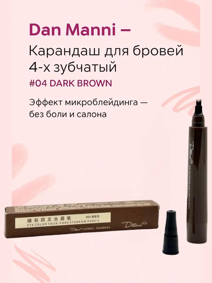 Это водостойкий карандаш-маркер с уникальным 4-зубчатым наконечником, который имитирует микроблейдинг без боли и салона. Цвет 04 — тёмно-коричневый (универсальный для шатенок и брюнеток, не уходит в рыжину.