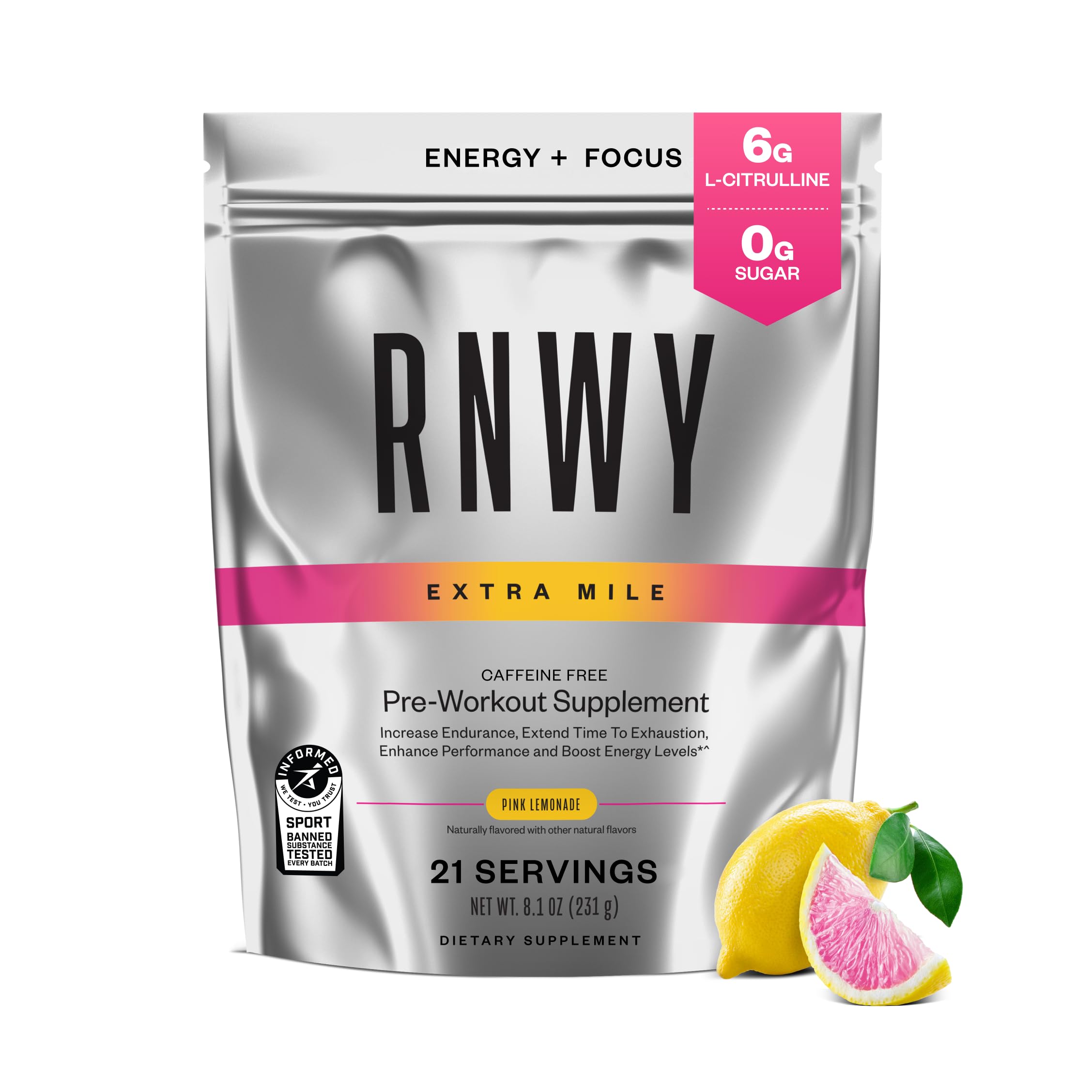 RNWY Extra Mile Caffeine Free Pre Workout Powder 6g L-Citrulline Sugar Free Stimulant Free with Dynamine and TeaCrine for Endurance and Focus 21 Servings (Pink Lemonade)