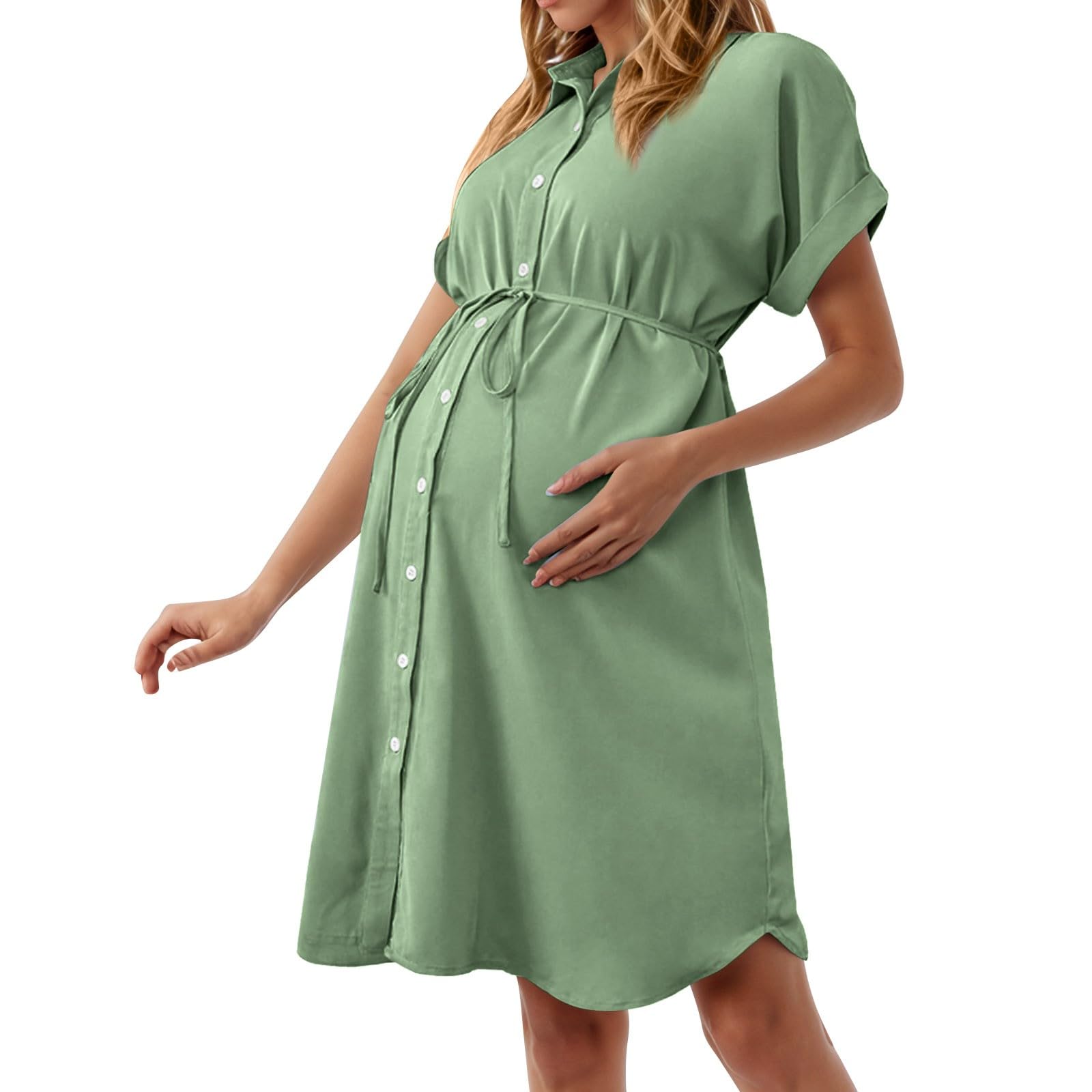 Robe de maternit d' t pour femmes enceintes - Robe midi l gante - Longueur genou - Robe d' t l g re et a r e - Robe de grossesse manches courtes - Col rond - Robe en mousseline de soie L Vert