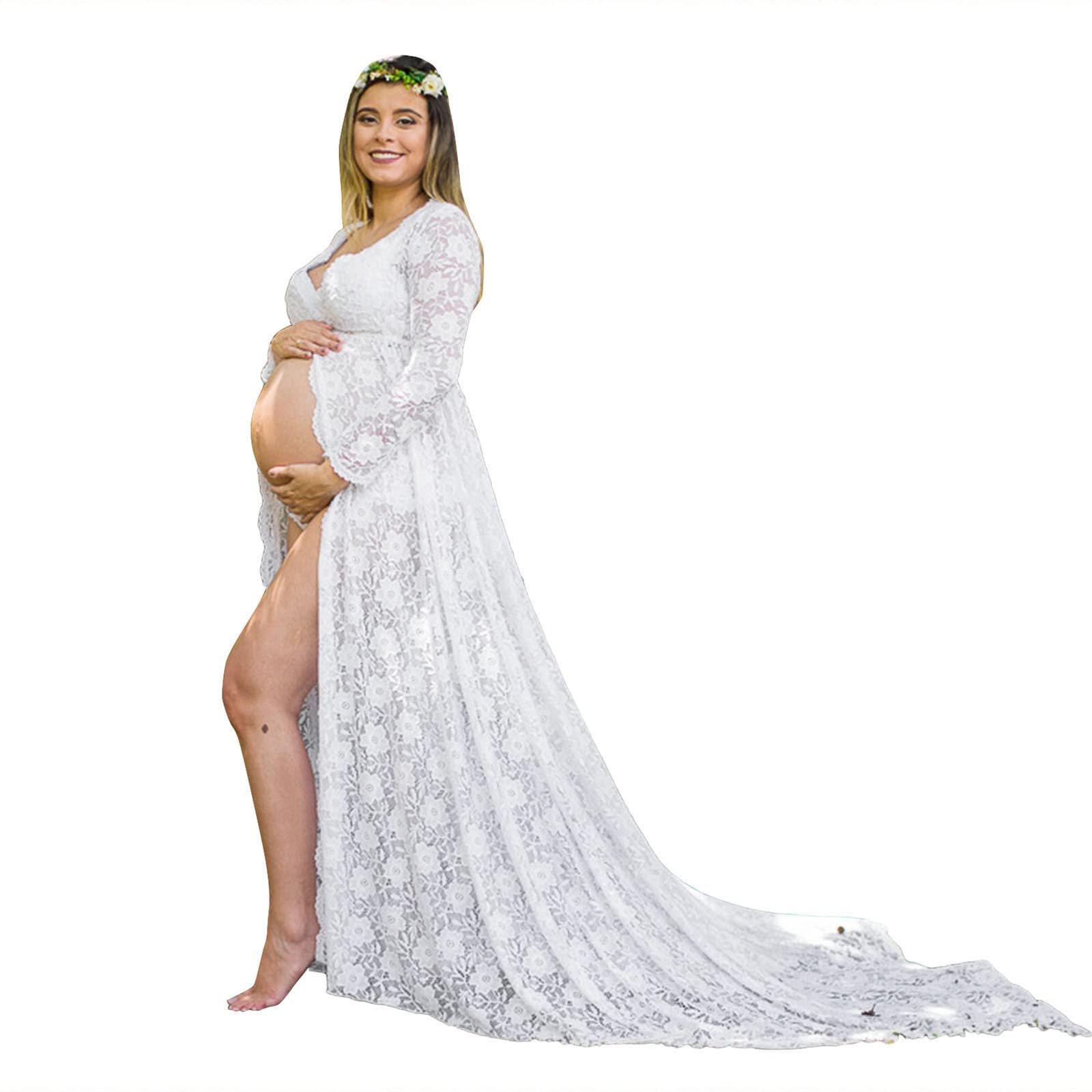Robe de maternit pour s ance photo - Manches longues - En dentelle - Mode de grossesse - Pour femmes enceintes - l gante - Dos creux - Robe d' t solide XL Blanc.