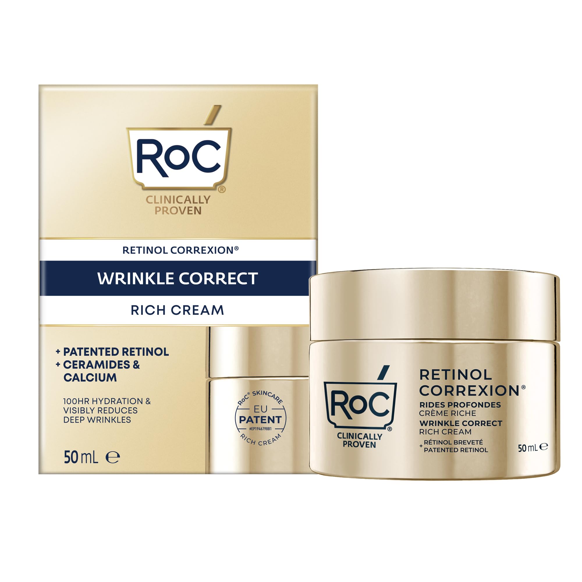 As you get older, estrogen levels decrease, making your skin look older and firmer. Developed in collaboration with dermatologists, NEW Deep Wrinkle Rich Cream helps reverse the 3 visible signs of estrogen loss: persistent dryness, deep wrinkles and a loss of firmness for dramatically younger-looking skin. Powered by RoC's patented Retinol—7x more powerful than traditional retinol—this skin-dampening formula is infused with bio-ceramides and revitalizing calcium to deliver up to 100 hours of deep, continuous hydration. The skin looks visibly smoother and firmer day after day. Dermatologist tested. Fragrance free.Paraben free. Free from cruelty. PETA approved. SAFETY WARNING For external use only: Avoid contact with eyes.Developed in collaboration with dermatologists, NEW Deep Wrinkle Rich Cream helps reverse the 3 visible signs of estrogen loss: persistent dryness, deep wrinkles and a loss of firmness for dramatically younger-looking skin.RoC Diepe Rimpel Rijke Crème 50ml Naarmate je ouder wordt, nemen de oestrogeenspiegels af, waardoor je huid er ouder en sneller uitziet. Ontwikkeld in samenwerking met dermatologen helpt NEW Deep Wrinkle Rich Cream de 3 zichtbare tekenen van oestrogeenverlies om te keren: aanhoudende droogheid, diepe rimpels en een verlies van stevigheid voor een dramatisch jonger uitziende huid. Aangedreven door RoC's gepatenteerde Retinol-7x krachtiger dan traditionele retinol - deze huiddempende formule is doordrenkt met bio-ceramiden en revitaliserend calcium om tot 100 uur diepe, continue hydratatie te leveren. De huid ziet er dag na dag zichtbaar gladder en steviger uit. Dermatoloog getest. Geurvrij.Parabenenvrij. Vrij van wreedheid. Peta-goedgekeurd. VEILIGHEIDSWAARSCHUWING Alleen voor uitwendig gebruik: Vermijd contact met de ogen.Ontwikkeld in samenwerking met dermatologen helpt NEW Deep Wrinkle Rich Cream de 3 zichtbare tekenen van oestrogeenverlies om te keren: aanhoudende droogheid, diepe rimpels en een verlies van stevigheid voor een dramatisch jonger uitziende huid.