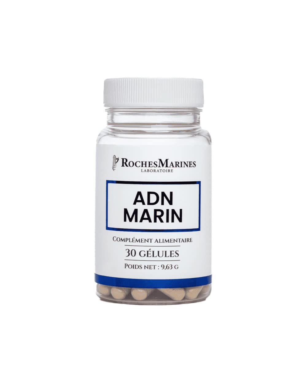 WHAT IS THE STORY OF ROCHES MARINES? We are a French company, founded in 2018 near Nantes. Since then, we have become a brand recognized for our innovative vision. Combining the power of marine products to serve your well-being, through the innovation we demonstrate in constantly searching for new molecules of marine origin exploitable for your health. All our products are subject to strict manufacturing procedures (HACCP procedures, etc.). QUALITY AND PURITY GUARANTEED. This dietary supplement was developed by our team of French scientists, whose laboratory is based in Nantes. Each supplement is certified GMO-free and nanoparticle-free (in accordance with regulations). We are members of BLUE FISH, an association that works to promote sustainable and responsible fishing. Finally, our supplements are subject to meticulous quality control by our quality and logistics department. Marine DNA is composed of wild fish milt. Wild fish roe naturally contains phosphorus, protein, and marine DNA. WHO IS IT RECOMMENDED FOR? Marine DNA is suitable for you if you want to maintain a good memory, obtain a supply of amino acids and protein, and if you want to provide your body with phosphorus and marine DNA. Marine DNA is a dietary supplement made from wild fish roe. This product provides amino acids, phosphorus, and marine DNA.QUELLE EST L'HISTOIRE DE ROCHES MARINES ? Nous sommes une entreprise Française, fondée en 2018 près de Nantes. Depuis, nous sommes une marque reconnue pour sa vision novatrice. Alliant la puissance des produits marins au service de votre bien-être, via l'innovation dont nous faisons preuve pour chercher sans cesse de nouvelles molécules d'origine marine exploitables au service de votre santé. Tous nos produits sont soumis à des procédures de fabrication strictes (procédures HACCP etc). QUALITE ET PURETE ASSUREES. Ce complément alimentaire a été développé par notre équipe de scientifiques Français, dont le laboratoire est basé à Nantes. Chaque complément est certifié sans OGM et sans nanoparticules (conformément à la réglementation). Nous sommes adhérents à BLUE FISH, une association qui oeuvre en faveur de la promotion de la pêche durable et responsable. Enfin, nos compléments font l'objet d'une vérification qualité méticuleuse par notre service qualité et logistique. ADN marin est composé de laitance de poisson sauvage. La laitance de poisson sauvage contient naturellement du phosphore, des protéines et de l'ADN marin. POUR QUI EST-IL CONSEILLÉ ? ADN marin vous conviendra si vous souhaitez conserver une bonne mémoire, obtenir un apport en acides animés et en protéines et si vous souhaitez apporter du phosphore et de l'ADN marin à votre organisme. ADN marin est un complément alimentaire à base de laitance de poisson sauvage. Ce produit apporte des acides aminés, du phosphore et de l'ADN marin.