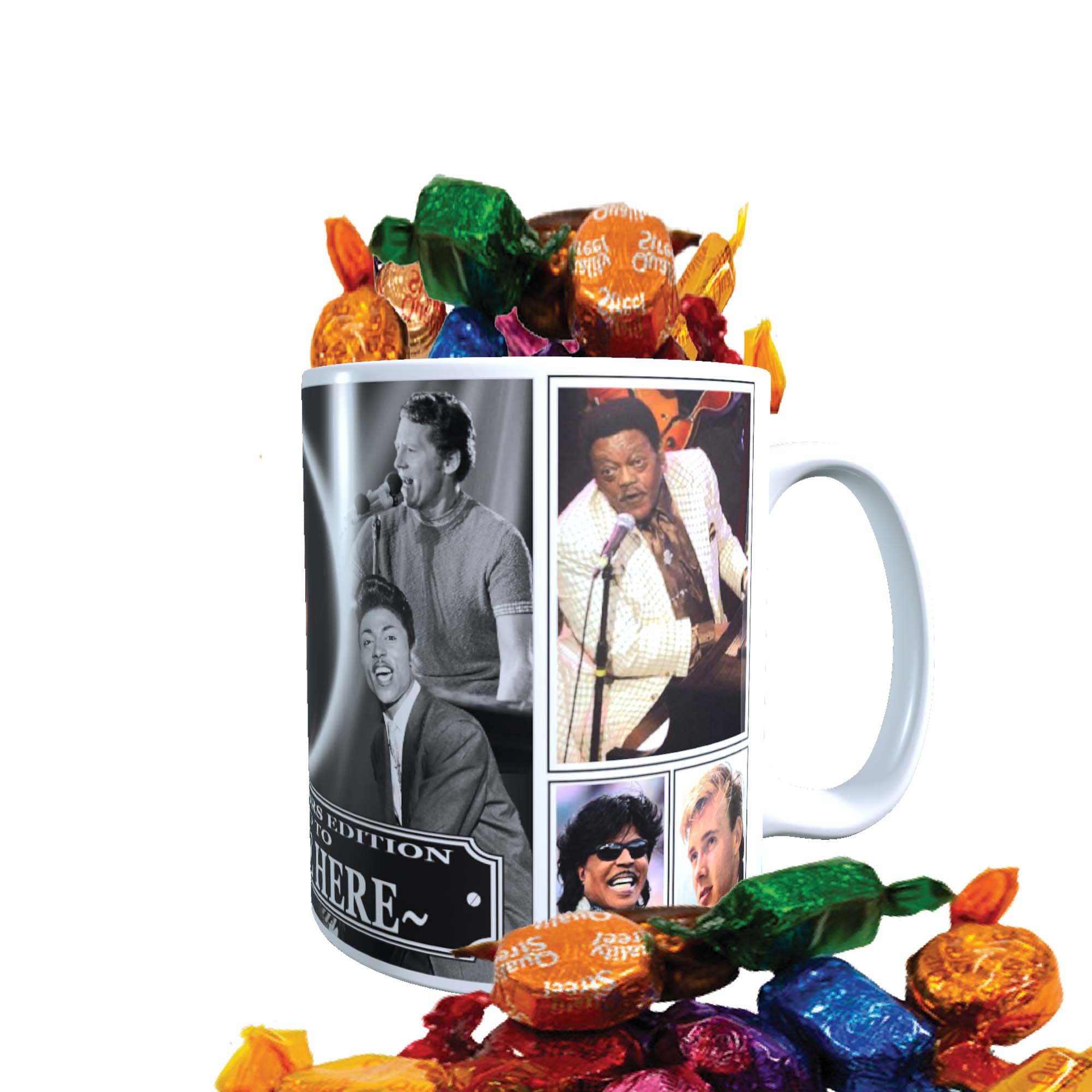 Our gloss-finish, ceramic mug is the ideal choice for the music fan who appreciates the Rock n Roll Legends from the 50s and 60s. Displaying colourful images of these icons, this mug is sure to delight any fan. For full ingredients of each sweet please contact us: LIQUORICE ASSORTMENT-This product contains wheat. QUALITY ST- May also contain traces of nuts, peanuts, tree nuts and cereals containing gluten. CHOCOLATE FOOTBALLS- This product contains milk and soya. VANILLA FUDGE (WRAPPED)- This product may contain egg and nut traces. FRUIT JELLIES-This product may contain nuts, milk, sesame seeds and gluten. FRUIT GUMMIES(HARIB0)-May contain traces of animal ingredients, including milk. Any image or text displayed on this unofficial product has been independently produced and is in no way connected with, or endorsed by the personalities, people, agents or organisations they may appear to depict.