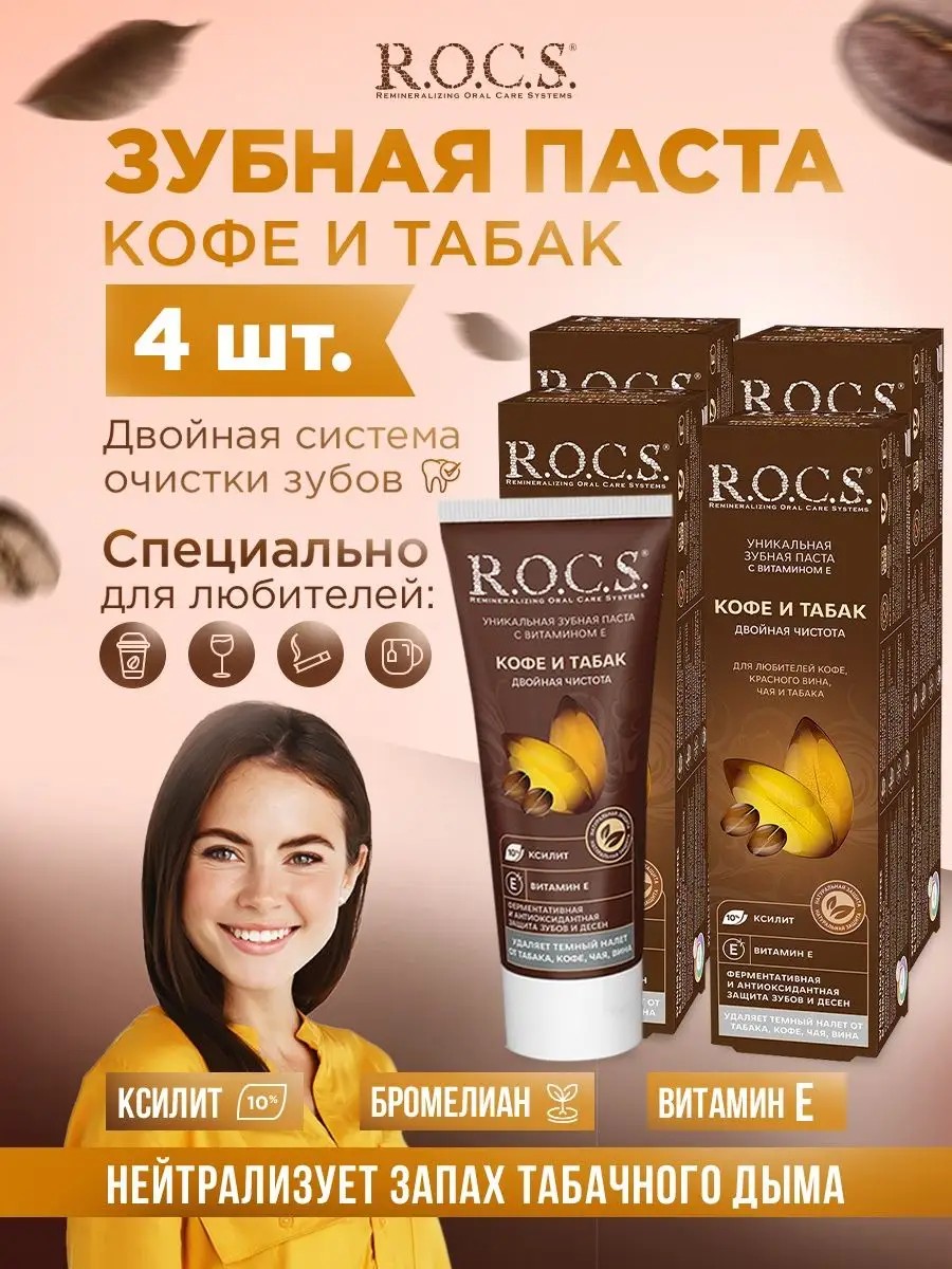 The Rocs Coffee and Tobacco Complex Toothpaste (4-pack) was created by leading experts for those who can't imagine life without coffee, red wine, tea, and cigarettes. Our mineral toothpaste is designed for daily care and eliminates the negative effects of smoking, among other things, and helps whiten your tooth enamel. It provides a high level of comprehensive protection for teeth and gums thanks to the action of BIO plant-based ingredients, whose activity is preserved thanks to the low-temperature toothpaste preparation technology. The Rocs brand complex, MINERALIN, consists of the natural enzyme bromelain, xylitol, and mineral compounds containing calcium, phosphorus, and magnesium ions. Rocs toothpaste includes a wide range of fragrances that eliminate the smell of tobacco smoke and ensure fresh breath and oral hygiene. We hope to see you among our customers. With love, yours, Rocs.