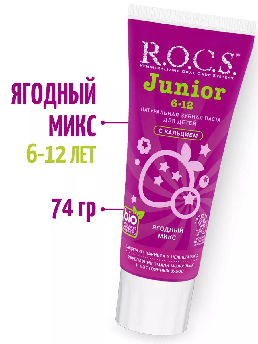 Детская зубная паста R.O.C.S. Junior Ягодный микс - отличное средство для ухода за зубками вашего малыша. Специально разработанная формула со вкусом ягодного микса делает чистку зубов не только эффективной, но и приятной для детей. Паста содержит все необходимые элементы, которые помогают предотвратить появление кариеса и укрепляют эмаль. Бережно очищает зубы от налета и защищает десны от воспалений. R.O.C.S. Junior Ягодный микс - лучший выбор для заботливых родителей, которые хотят обеспечить своему ребенку здоровые зубы и красивую улыбку.