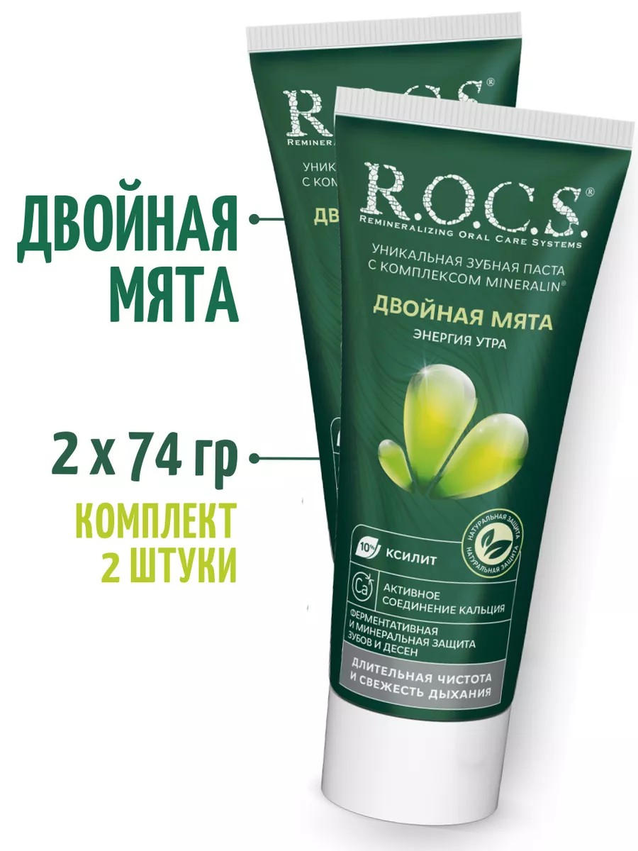 2шт в комплекте. Зубная паста R.O.C.S. "Энергия утра" со вкусом "Двойная Мята" рекомендована для регулярного ежедневного применения взрослым и детям, начиная с 4-х лет. Она имеет лечебно-профилактическое действие. Уникальный состав пасты способствует качественному очищению зубов, предупреждению развития кариеса и зубного камня. Уникальный минеральный комплекс обеспечивает укрепление твердых тканей зуба, а также, профилактику воспалительных прочесов десен, что является важными аспектами ежедневной гигиены, как во взрослом, так и в детском возрасте.