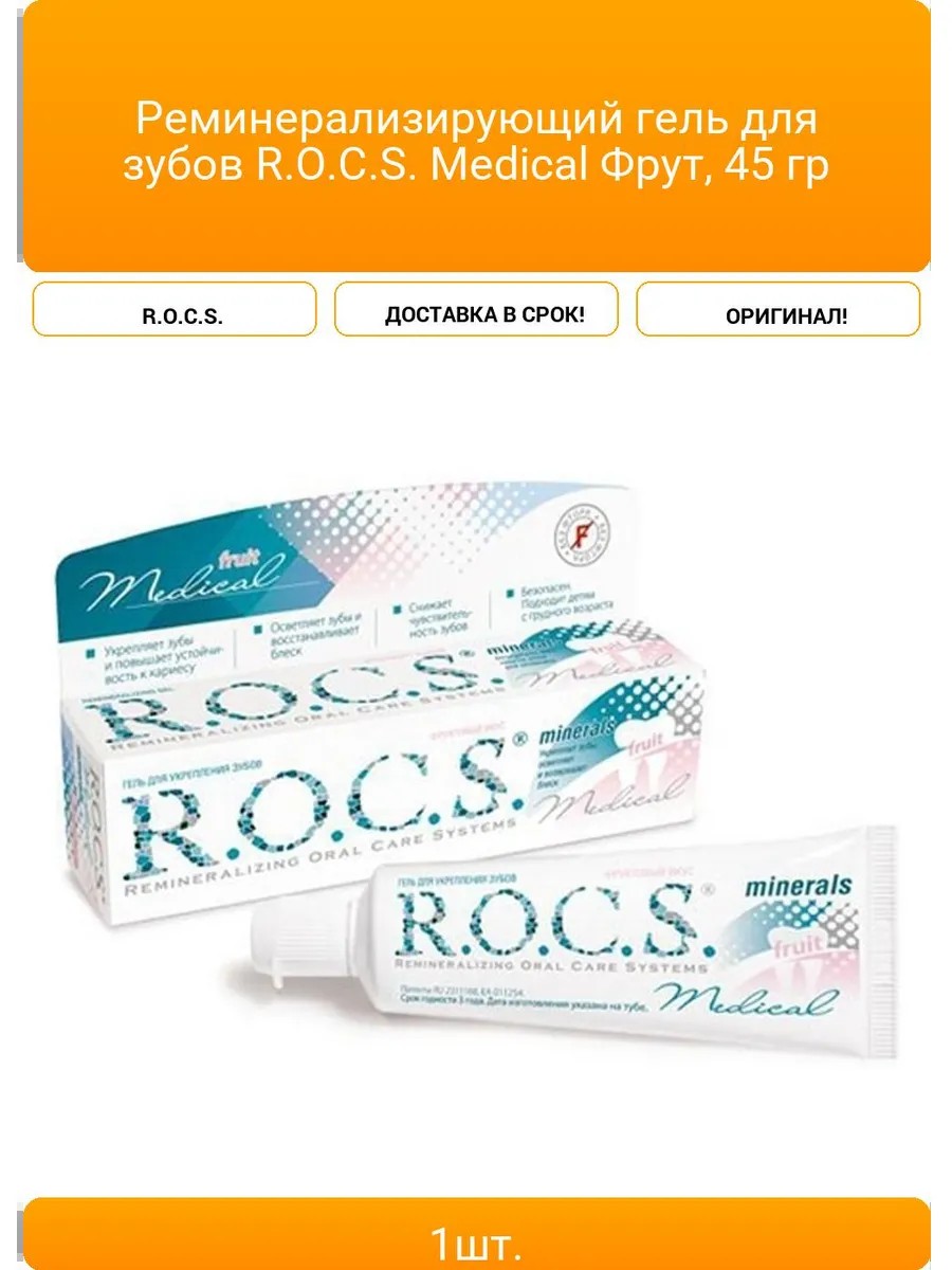 | Комплектация | Реминерализирующий гель для зубов R.O.C.S. Medical Фрут, 45 гр |