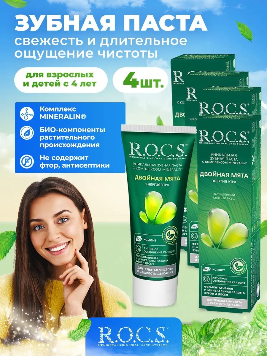 Набор зубных паст 4 шт rocs Двойная Мята обеспечивает высокий уровень комплексной защиты зубов и десен за счет действия БИО компонентов растительного происхождения, активность которых сохраняется благодаря низкотемпературной технологи приготовления антибактериальной зубной пасты. Комплекс MINERALIN бренда РОКС, который состоит из натурального фермента бромелаина, ксилита и минеральных соединений источников ионов кальция, фосфора и магния усилен экстрактом мяты, являющимся источником полифенолов мощных природных антиоксидантов, за счет которых экстракт обладает ярко выраженными противомикробными и противовоспалительными свойствами. Ксилит защищает от бактерий, вызывающих кариес и способствует усвоению кальция. Так же другие компоненты состава зубной пасты укрепляют эмаль, возвращают белизну эмали. Бромелаин бережно устраняет зубной налет и препятствует его появлению. Надеемся увидеть вас в числе наших покупателей, с любовью, ваш Рокс.