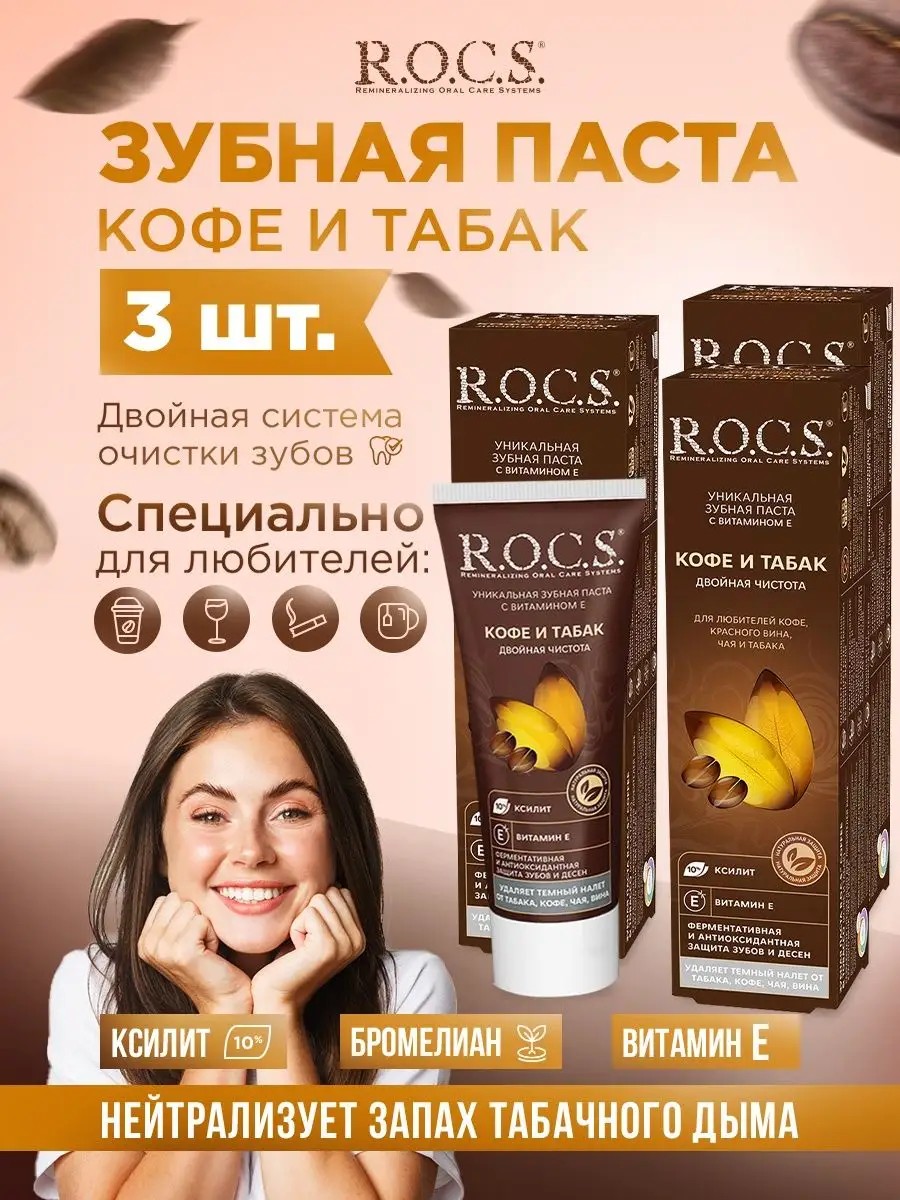 The Rocs Coffee and Tobacco Complex Toothpaste (set of 3) was created by leading experts for those who can't imagine life without coffee, red wine, tea, and cigarettes. Our mineral toothpaste is designed for daily care and eliminates the negative effects of smoking, among other things, and helps whiten your tooth enamel. It provides a high level of comprehensive protection for teeth and gums thanks to the action of BIO plant-based ingredients, whose activity is preserved thanks to the low-temperature technology of toothpaste preparation. The Rocs brand complex MINERALIN, which consists of the natural enzyme bromelain, xylitol, and mineral compounds containing calcium, phosphorus, and magnesium ions, includes a wide range of fragrances that eliminate the smell of tobacco smoke and ensure fresh breath and oral hygiene. We hope to see you among our customers. With love, yours, Rocs.