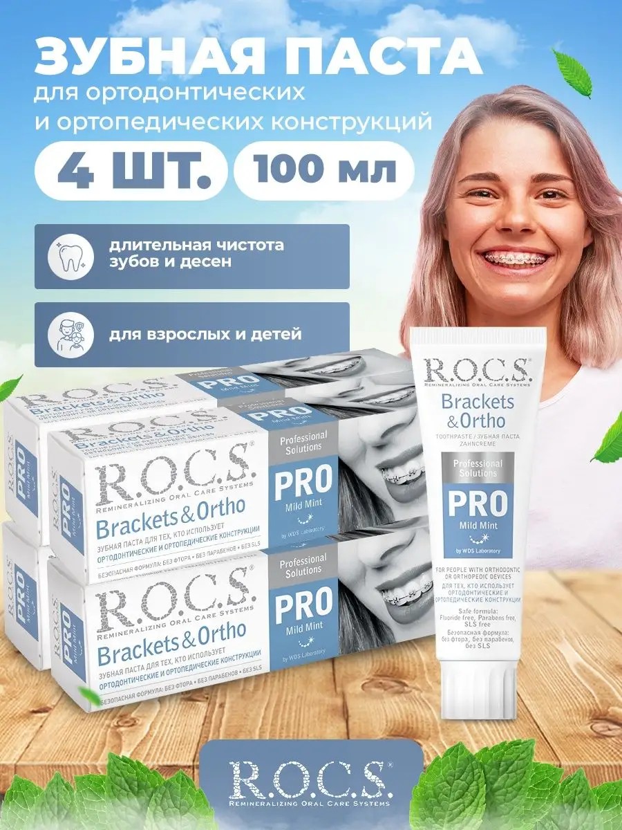Комплексная зубная паста для зубов rocs Brackets&Ortho 4 шт созданы для взрослых и детей со специальными вставками или брекет-системами, которые затрудняют чистку зубов и повышают риск кариеса и болезней десен. Наличие в составе пасты рокс активного протеолитического фермента позволяет очищать зубы на участках, недоступных щетке, нивелировать факторы воспаления и обеспечивает длительную чистоту зубов и чувствительных десен. Бромелаин в составе ROCS ( РОКС рокс ) - фермент растительного происхождения бережно растворяет зубной налет. Ксилит защищает от бактерий, вызывающих кариес. Кальций укрепляет эмаль, возвращает ей естественную белизну, оказывая отбеливающий эффект. Специальные натуральные гранулы распадаясь на более мелкие в процессе чистки счищают налет и полируют эмаль, придавая ей сверкающую белизну. Будем рады увидеть вас в числе наших покупателей. С уважением и любовью, ваш R.O.C.S.