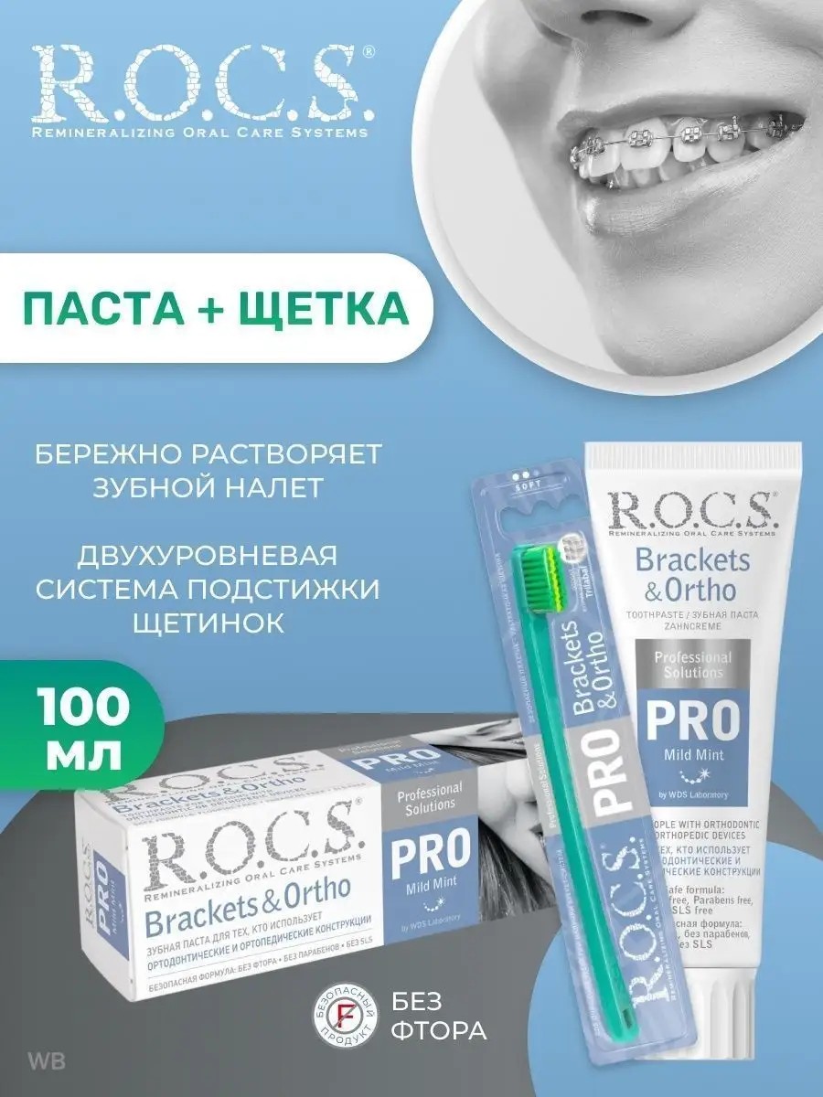 Набор зубной пасты и щетки для зубов rocs Brackets& Ortho созданы для взрослых и детей со специальными вставками или брекет-системами, которые затрудняют чистку зубов и повышают риск кариеса и болезней десен. Наличие в составе пасты рокс активного протеолитического фермента позволяет очищать зубы на участках, недоступных щетке, нивелировать факторы воспаления и обеспечивает длительную чистоту зубов и чувствительных десен. Бромелаин - фермент растительного происхождения бережно растворяет зубной налет. Ксилит защищает от бактерий, вызывающих кариес. Кальций укрепляет эмаль, возвращает ей естественную белизну, оказывая отбеливающий эффект. Специальные натуральные гранулы распадаясь на более мелкие в процессе чистки счищают налет и полируют эмаль, придавая ей сверкающую белизну. Зубная щетка бренда РОКС (ROCS) имеет специальную двухуровневую подстрижку. С уважением и любовью, ваш R.O.C.S.