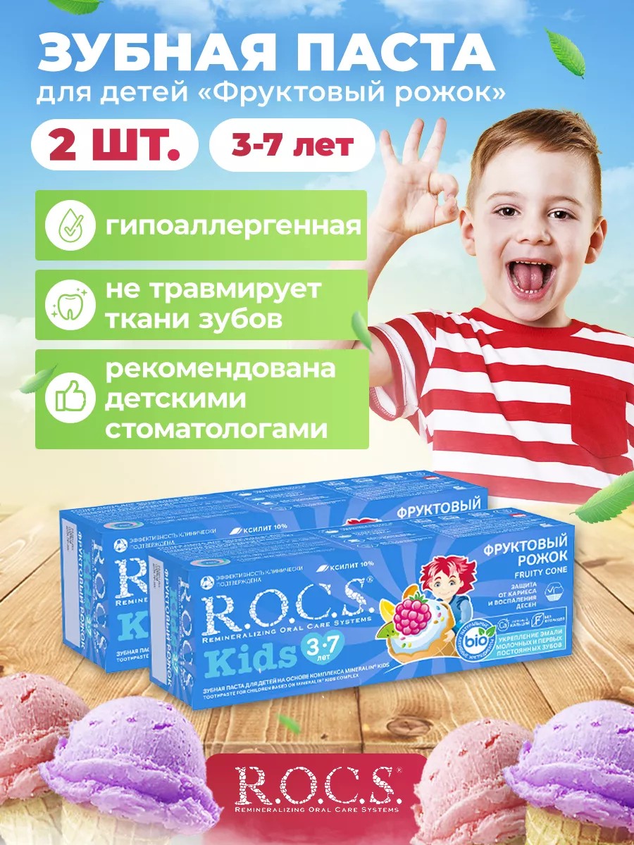 Комплексный набор из детских зубных паст для мам и малышей Rocs Фруктовый Рожок 2 шт с высокой концентрацией ксилита, благодаря чему обеспечивается устойчивость зубов к растворяющему действию кислот, надёжная защита дёсен от воспаления, защита зубов от кариеса, бактерий. Кальций в пасте rocs укрепляет эмаль, вовзращая ей естественную белизну. Так же в составе пасты ROCS содержится биодоступное соединение кальция, фосфора и магния, которые укрепляют эмаль и интенсивно насыщают ее минералами. Свойство пасты быстро образовать защитный слой очень важна, так как многие дети не выдерживают рекомендованное время чистки зубов (3 минуты). В отличие от корейских паст, РОКС не травмирует ткани зубов (RDA 45). Для чистки зубов малышей рекомендуется использовать небольшое количество пасты. Надеемся увидеть Вас в числе наших покупателей. С любовью и заботой, Ваш Рокс.