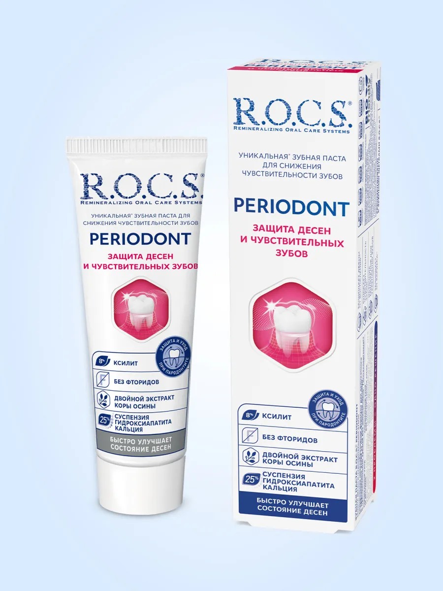 Зубная паста для ежедневного использования R.O.C.S. Periodont снижает кровоточивость, уменьшает отек и дискомфорт, уменьшает чувствительность десен и зубов, укрепляет структуру зуба, восстанавливает блеск и белизну эмали, защищает от кариеса, а так же придает свежесть дыханию. Двойной экстракт коры осины, благодаря мощным противовоспалительным, антиоксидантным и вяжущим свойствам, защищает десна от воспаления. Натрия бикарбонат позволяет уменьшить отек и нормализовать уровень кислотности в полости рта. Ксилит (8%) препятствует развитию кариесогенной микрофлоры и формированию зубного налета, а также восстанавливает баланс полезной микрофлоры, способствует усвоению кальция. Кальций-фосфатное соединение с высокой биодоступностью и биосовместимостью способствует реминерализации эмали зубов и повышает устойчивость зубов к кариесу. Разноразмерные частицы гидроксиапатита, имеющие высокое сродство к тканям зуба, обеспечивают снижение чувствительности путем запечатывания мельчайших дефектов эмали и канальцев обнаженного дентина. Экстракт двух видов жимолости снижает кровоточивость и болезненность десен.