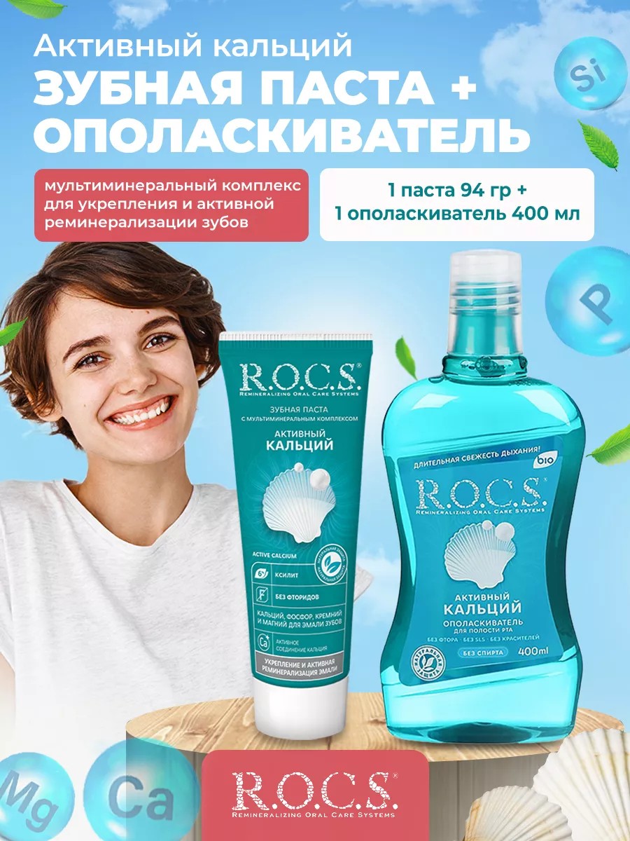 Active Calcium Toothpaste Set (1 pc.) + Mouthwash 1+1. The Rocs Active Calcium toothpaste set with a bioavailable component integrates into the enamel structure, restoring whiteness and shine, saturating it with minerals, and protecting against cavities. The multimineral antibacterial complex includes silicon, calcium, and phosphorus in an optimal ratio for teeth. Xylitol in Rocs toothpaste prevents plaque buildup and restores the balance of beneficial microflora. In addition to freshening breath, it is also suitable for people with sensitive teeth and various defects due to its low abrasiveness. The effect will only be visible with daily use of this natural toothpaste. Rocs products also do not contain fluoride, antiseptics, or synthetic dyes. Rocs Active Calcium Mouthwash (400 ml) is designed to strengthen and protect gums with daily care, reduce the risk of inflammation, restore mineral balance to teeth, and prevent cavities. This ROCS mouthwash is made with natural ingredients and contains bioavailable calcium, phosphorus, and magnesium compounds that effectively mineralize tooth enamel. The formula is enhanced with xylitol, which provides additional protection against cavities with regular daily use. This product is an effective complement to Rocs toothpastes and toothbrushes. It also reduces bleeding gums, promotes wound healing, and freshens breath. Does not contain: alcohol, sodium lauryl sulfate, fluoride, dyes, chlorhexidine, or triclosan. Sincerely yours, Rocs.