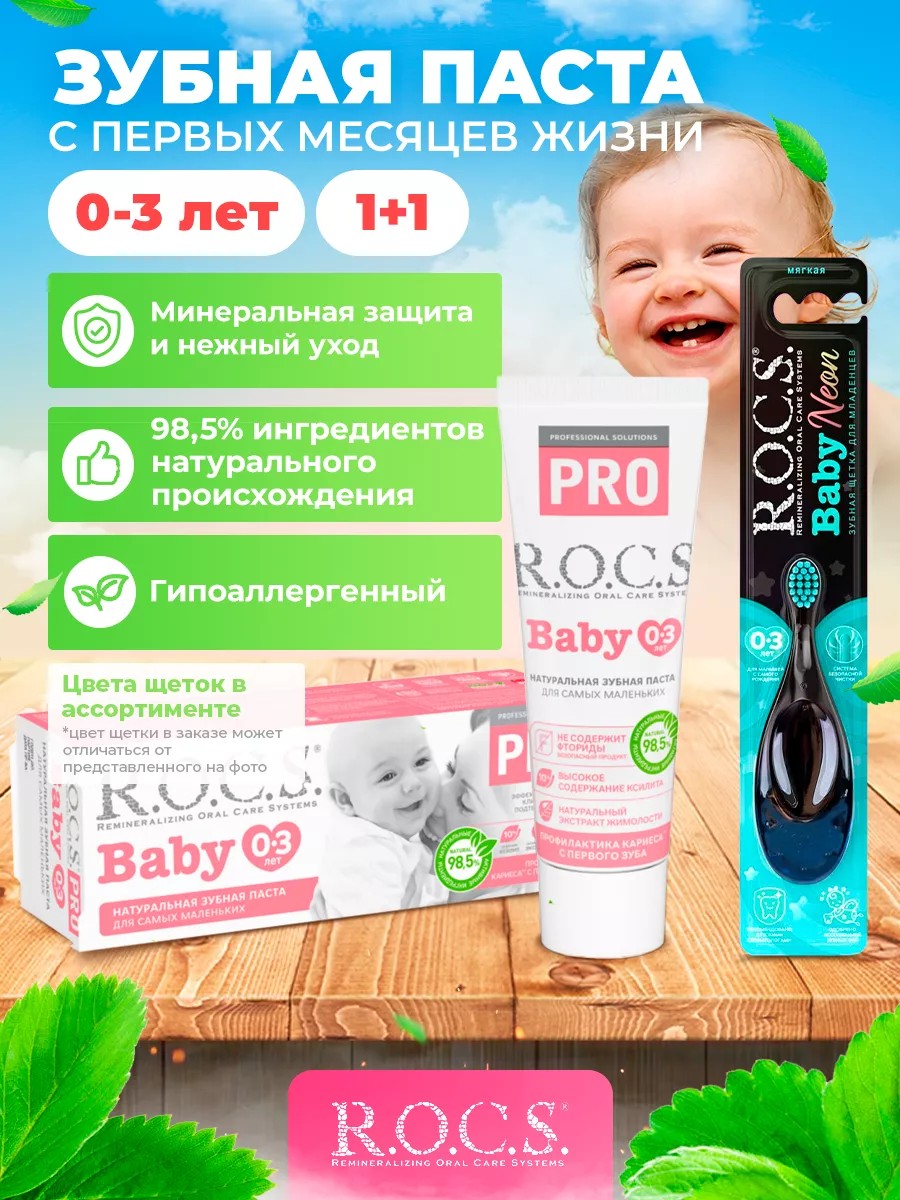 Комплексный набор из детской зубной пасты для мам и малышей Rocs Pro Baby Минеральная защита и Нежный уход и зубной щеткой Baby Neon с высокой концентрацией ксилита, благодаря чему обеспечивается устойчивость зубов к растворяющему действию кислот, надёжная защита дёсен от воспаления, защита зубов от кариеса, бактерий. Паста бренда ROCS приготовлена на очень мягкой основе, которая, с одной стороны, обеспечивает качественную очистку зубов, а с другой стороны, не травмирует тонкую эмаль молочных зубов. Свойство пасты быстро образовать защитный слой очень важна, так как многие дети не выдерживают рекомендованное время чистки зубов (3 минуты). РОКС не травмирует ткани зубов (RDA 45). Содержит 98,5% ингредиентов натурального происхождения. Для чистки зубов малышей рекомендуется использовать небольшое количество пасты. разработана при участии детских стоматологов. В возрасте 0 до 3-х лет зубы ребенку должны вычищать родители, соблюдая правильную технику чистки зубов. Уникальная форма ручки позволяет избежать избыточного надавливания на зубы и десны малыша во время чистки, не повреждая десны и незрелую эмаль зубов. Ручка зубной щетки rocs выполнена из высококачественного безопасного пластика PET и обладает уникальной формой, удобной в использовании как малышу, так и родителям. Широкая форма ручки препятствует глубокому проникновению щетки в полость рта ребенка. Зубная щетка РОКС будет наравне очищать ротовую полость и язык от налета и бактерий не хуже ортодонтической, звуковой или электрической щетки. Щетки рокс могут использоваться для чистки и позволят забыть минимум месяц о покупке сменных или одноразовых дорожных щеток. Надеемся увидеть Вас в числе наших покупателей. С любовью и заботой, Ваш Рокс.