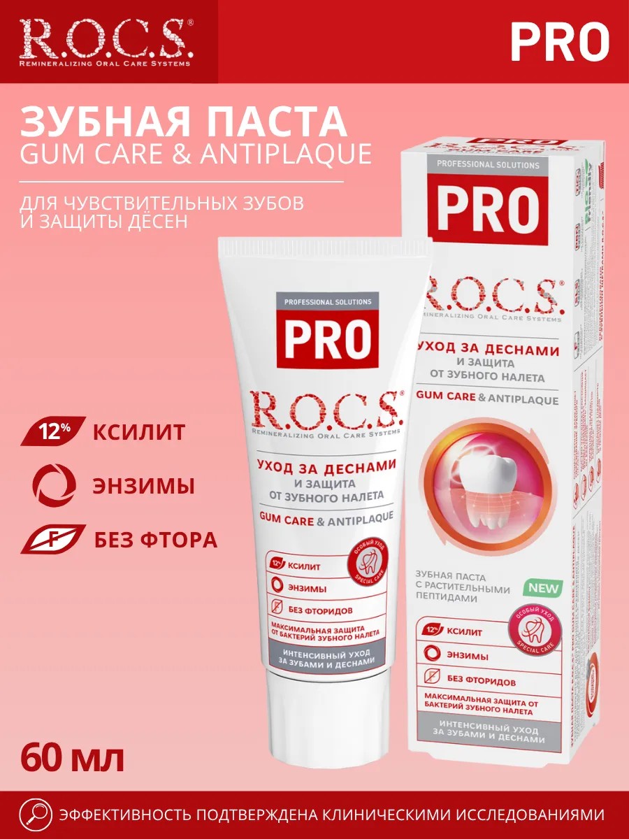 Зубная паста для ежедневного использования R.O.C.S. Pro Gum Care & Antiplaque уменьшает риск возникновения заболеваний в полости рта, основной причиной которых является зубной налет. Паста существенно замедляет образование зубного налета, быстро улучшает состояние десен, уменьшает кровоточивость, защищает от бактерий, укрепляет эмаль, эффективна против кариеса, сохраняет гладкость и чистоту зубов в течение дня. Растительный фермент растворяет зубной налет, препятствует адгезии бактерий, снижает воспаление и уменьшает кровоточивость десен. Ксилит 12% нормализует микробный баланс, способствует реминерализацииэмали. Биодоступные соединения минералов реминерализуютэмаль, восстанавливают естественный блеск и белизну зубов