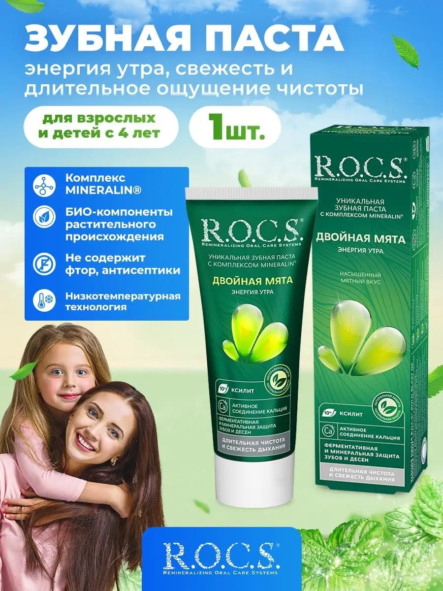 Зубная паста ROCS 1 шт Двойная Мята обеспечивает высокий уровень комплексной защиты зубов и десен за счет действия БИО компонентов растительного происхождения, активность которых сохраняется благодаря низкотемпературной технологи приготовления антибактериальной зубной пасты Rocs. Комплекс MINERALIN бренда РОКС, который состоит из натурального фермента бромелаина, ксилита и минеральных соединений источников ионов кальция, фосфора и магния усилен экстрактом мяты, являющимся источником полифенолов мощных природных антиоксидантов, за счет которых экстракт обладает ярко выраженными противомикробными и противовоспалительными свойствами. Ксилит защищает от бактерий, вызывающих кариес и способствует усвоению кальция. Бромелаин в составе бережно устраняет зубной налет и препятствует его появлению. Надеемся увидеть вас в числе наших покупателей, с любовью, ваш Рокс.
