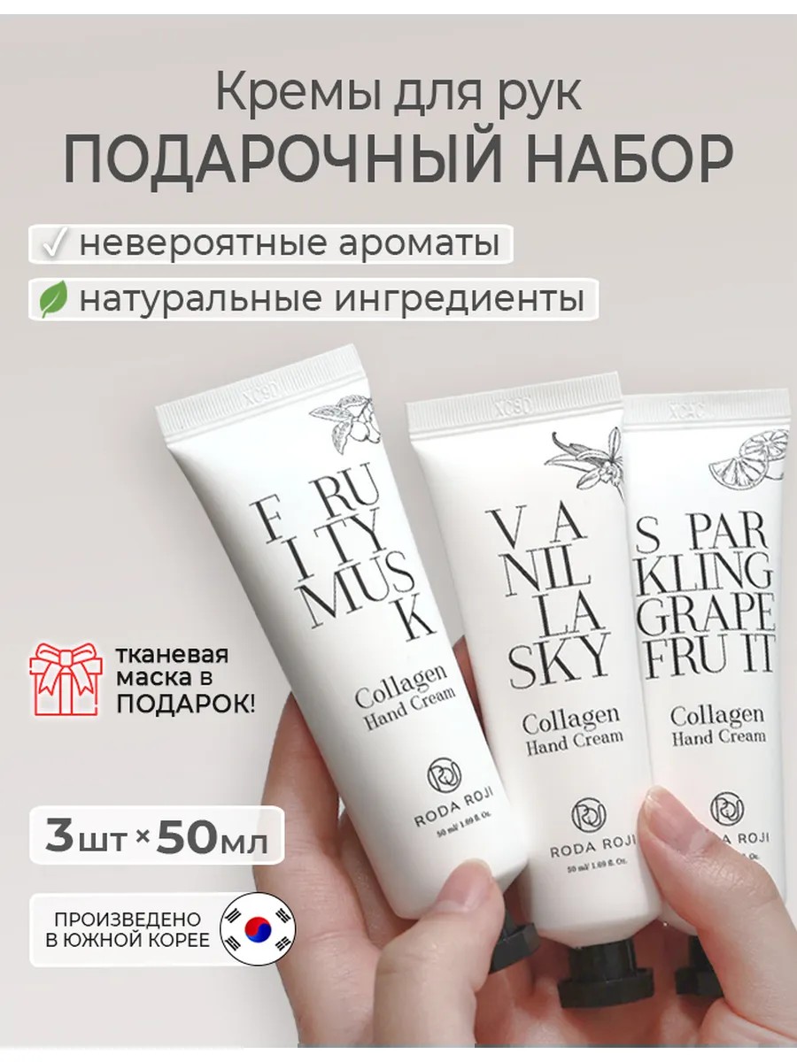 Защитный лифтинг крем для рук Roda Roji Fruity Musk Collagen Hand Cream оставляет тонкий элегантный шлейф сладковатого аромата фруктов и жасмина. Защитный лосьон для рук Vanilla Sky Collagen Hand Cream обладает теплым и спокойным ароматом, созданным сочетанием ванили и мускуса. Roda Roji Sparkling Grapefruit Collagen Hand Cream окутывает ароматом сладковатого грейпфрута и свежей зелени.