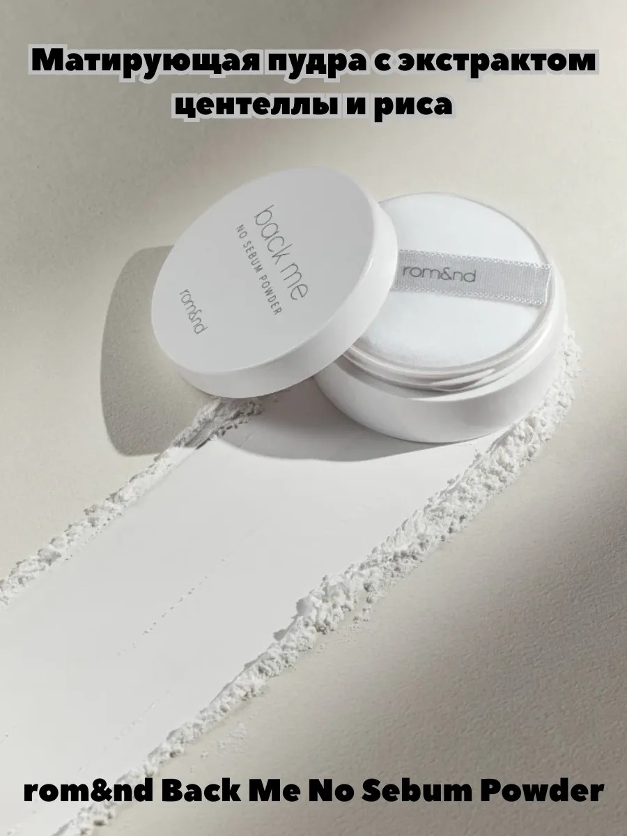 Матирующая пудра с экстрактом центеллы и риса rom&nd Back Me No Sebum Powder создаёт на коже безупречно гладкое покрытие, без жирного блеска и шелушений. Выравнивает тон, уменьшает видимость несовершенств рельефа, делает кожу гладкой. Успокаивает и смягчает кожу, не скатывается и не западает в поры, равномерно распределяется. Содержит экстаркты центеллы азиатской и риса.