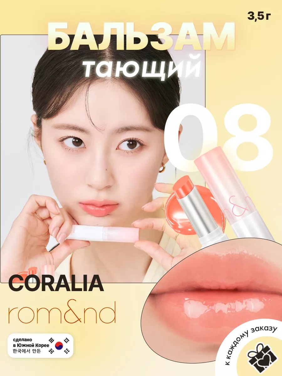 Rom&nd Glasting Melting Balm 08 CORALIA is a tinted lip balm with a plant-based moisturizing oil. The balm provides a transparent and smooth watery glow without a tight feeling. This vibrant, colored lip balm gives lips a rich color the moment you apply it.