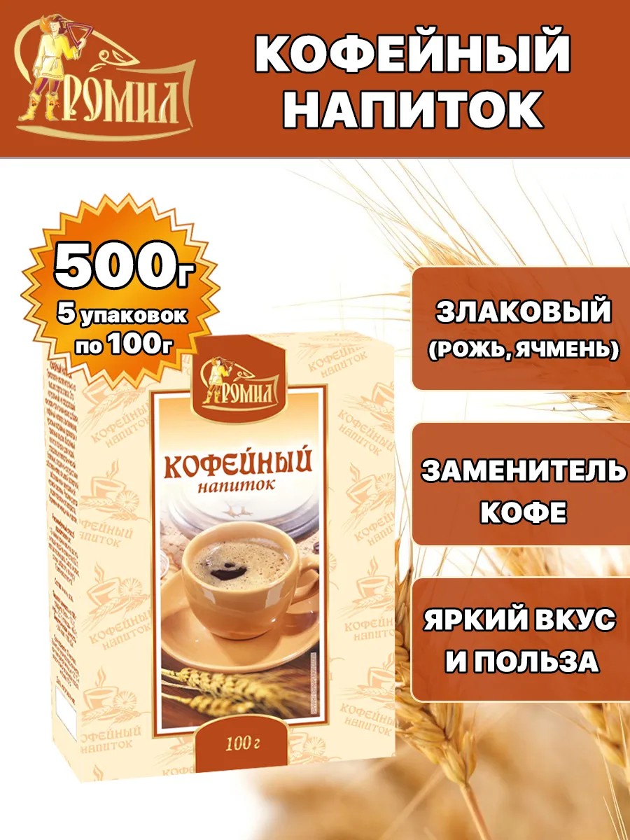 Некоторые люди вынуждены отказаться от традиционного бодрящего и ароматного натурального кофе. Ячменно-ржаной напиток - альтернатива кофе, сходная вкусом и безвредная для здоровья. Несмотря на всю пользу и явные преимущества, злаковый кофе долгое время оставался недооцененным. Сегодня, благодаря моде на здоровый образ жизни, натуральный заменитель кофе без кофеина уверенно отвоёвывает потерянные позиции. Правильно приготовленный кофе из ржи и ячменя не только порадует своим вкусом, но и поможет укрепить здоровье. Быстрорастворимый кофейный злаковый напиток «Ромил» приготовлен исключительно из высших сортов злаков. Напиток кофейный не содержит консерванты и химических добавок. В отваре злаков много клетчатки и белка, витаминов, а также микро и макроэлементы, включая пищевые волокна бета-глюканы, которые участвуют в очистке организма от холестерина, токсинов и других вредных веществ. Натуральный злаковый напиток полезен для людей, страдающих гипертонической болезнью, сердечно-сосудистыми заболеваниями, пищевой аллергией, заболеваниями центральной нервной системы. Помимо прочих полезных элементов, в ячменно-ржаном кофе содержатся кремний и лизин. Они способствуют синтезу коллагена, а он, в свою очередь, оказывает положительное воздействие на кожу, омолаживает её и улучшает тонус. При умеренном употреблении настой из злаков приносит организму только пользу.