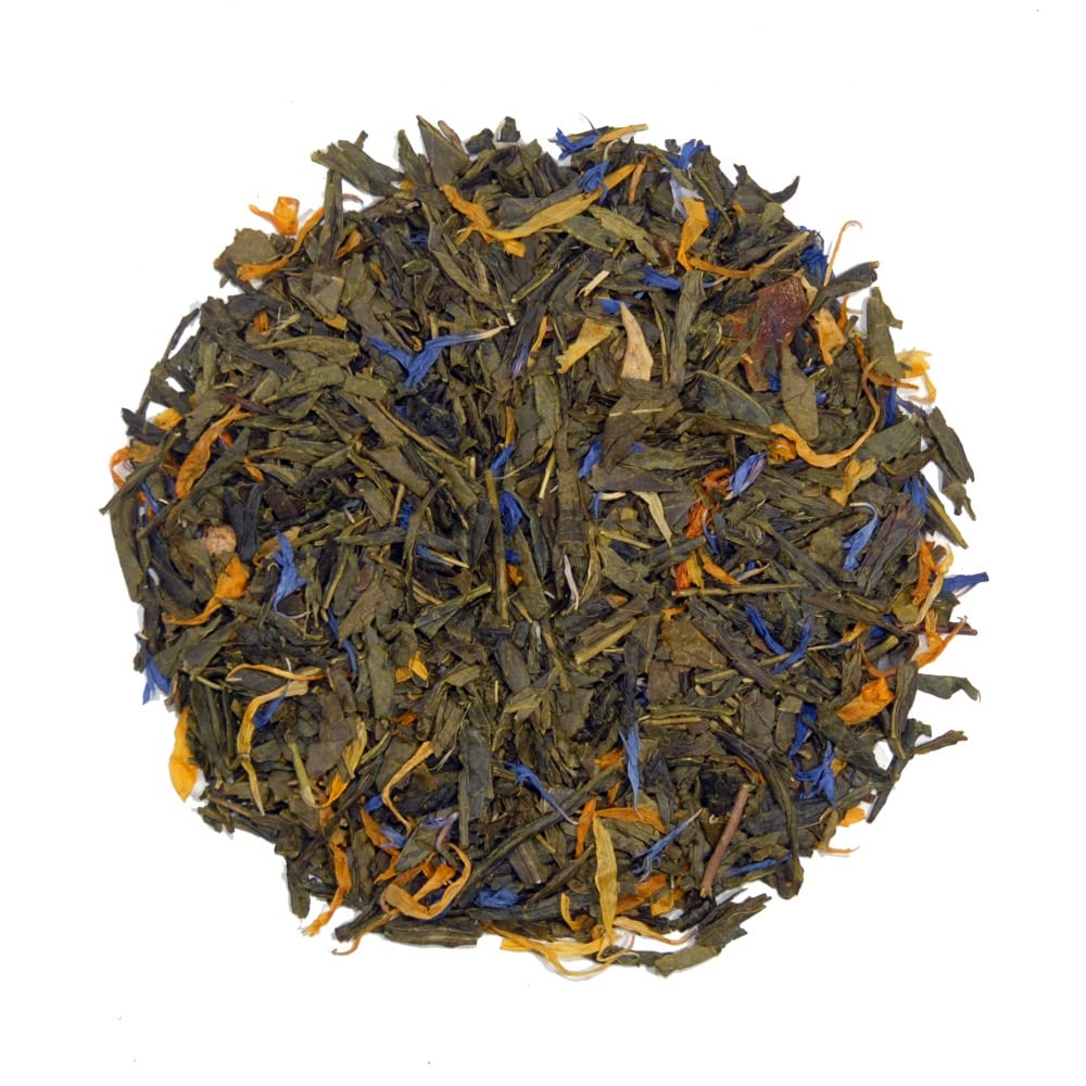 Sun-ripened mango and tropical fruits on green sencha tea - Sweet and exotic - fresh taste. INGREDIENTS Green tea (Sencha) 84 , mango pieces 8 , natural flavorings, marigold and cornflower petals