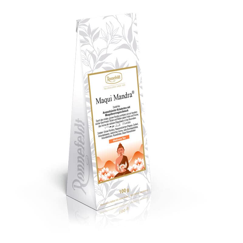 The new lightness in delicate pink. Mild and fruity taste – deliciously sweet. The special touch: carrot pieces. Ingredients: apple pieces, rosehip peel, hibiscus, pineapple pieces, currant, lemongrass, peppermint leaves, carrot pieces, papaya pieces, orange peel. INGREDIENTS Apple pieces, rosehip peel, hibiscus, pineapple pieces, currant, lemongrass, peppermint leaves, carrot pieces, papaya pieces, orange peel. Manufacturer: J.T. Ronnefeldt KG, Kurfürstenplatz 38, 60486 Frankfurt am Main, Germany. Average nutritional value per 100 ml. Energy value 6kJ 2kcal, fat 0.1g, of which saturates 0.1g, carbohydrates 0.2g, of which sugars 0.1g, protein 0.1g, salt 0.01g.Ronnefeldt - Maqui Mandra - Thé aux herbes de bien-être - 100 gDESCRIPTION DU PRODUIT DESCRIPTION DU PRODUIT La nouvelle légèreté en rose délicat. Goût doux et fruité – délicieusement sucré. La touche spéciale : morceaux de carotte. Ingrédients : morceaux de pomme, écorce de cynorhodon, hibiscus, morceaux d'anananas, corinthe, citronnelle, feuilles de menthe poivrée, morceaux de carotte, morceaux de papaye, écorce d'orange. INGRÉDIENTS Pépites de pomme, écorce de lunch, hibiscus, morceaux d'anananas, corinthe, citronnelle, feuilles de menthe poivrée, morceaux de carotte, morceaux de papaye, écorce d'orange Fabricant : J.T. Ronnefeldt KG, Kurfürstenplatz 38, 60486 Frankfurt am Main, Allemagne, valeur nutritionnelle moyenne par 100 ml valeur énergétique 6kJ 2 kcal, lipides 0,1 g, dont acides gras saturés 0,1 g, glucides 0,2 g, dont sucre 0,1 g, protéines 0,1 g, sel 0,0,0,0,1 g. 01 g