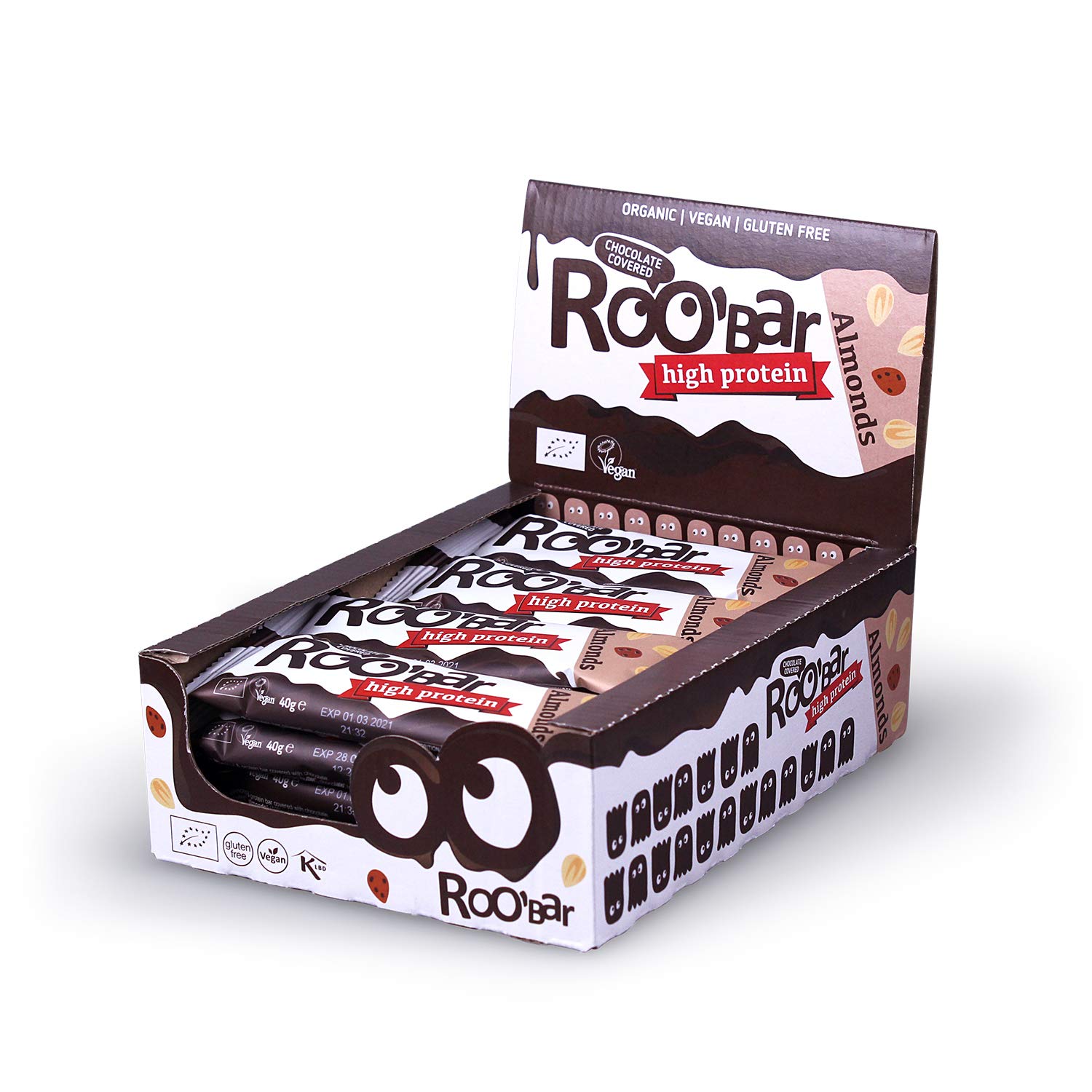 Roobar High Protein Almond Bar Ingredients: Coconut syrup , chocolate (cocoa mass , coconut sugar , coconut cream , cocoa butter , sunflower lecithin ) (16 ), dates , roasted almonds (almonds , salt) (12 ), cocoa butter , rice protein (9 ), pea protein (9 ), hazelnut tahini , cocoa powder . From organic farming. May contain traces of fruit pits, nut shells, sesame seeds, peanuts, and other tree nuts. Instructions for use: Consume directly from the packaging. See moreNUTRITION FACTS: per 40g - Energy: 830kJ 199kcal, Fat: 12g of which saturates: 5.2g, Carbohydrates: 13g of which sugars: 11g, Protein: 8.4g, Fiber: 1.8g, Salt: 0.12g. Ingredients: coconut syrup , chocolate (cocoa mass , coconut sugar , coconut cream , cocoa butter , sunflower lecithin ) (16 ), dates , roasted ALMONDS (ALMONDS , salt) (12 ), cocoa butter , rice protein (9 ), pea protein (9 ), HAZELNUT tahini , cocoa powder . From organic farming. May contain traces of fruit pits, nut shells, SESAME seeds, PEANUTS and other TREE NUTS. Roobar chocolate covered bars come from our state-of-the-art factory which covers all the requirements for organic production with the highest quality standards in production, packaging and raw ingredients from certified organic agriculture. Our certificates: Organic, IFS, Fairtrade, Kosher, Vegan, V-label. Bio-certified and Vegan-certified. A simple recipe of just a few, but very powerful, all natural ingredients. Gluten and diary free, with no added refined sugar and no palm oil, artificial colors, preservatives and aromas. The recipe is carefully created for people following a balanced diet. An eye-catching box of 16 bars, covered with fine dark natural chocolate. Based on almond and coconut flour and sweetened with rice syrup and coconut sugar. Each protein bar is individually packed which makes it perfect for a quick snack for your trip, a busy day in the office or hiking with the gang.Description du produit Roobar High Protein Almond bar Ingrédients sirop de coco , chocolat (pate de cacao , sucre de coco , crème de coco , beurre de cacao , lécithine de tournesol ) (16 ), dattes , AMANDES grillées (AMANDES , sel) (12 ), beurre de cacao , protéine de riz (9 ), protéine de pois (9 ), tahini aux NOISETTES , poudre de cacao . de l'agriculture biologique. Peut contenir des traces de noyaux de fruits, de coquilles de fruits à coque, de graines de SÉSAME, D'ARACHIDES et d'autres FRUITS À COQUE. P.when('A').execute(function(A) { A.on('a:expander:toggle_description:toggle:collapse', function(data) { window.scroll(0, data.expander. expander[0].offsetTop-100) }) }) Mode d'emploi À consommer directement à partir de l'emballage. Voir plusNUTRITION FACTS: per 40g - Energy: 830kJ 199kcal, Fats: 12g of which saturated: 5.2g, Carbohydrates: 13g of which sugars: 11g, Proteins: 8.4g, Fiber: 1.8g, Salt: 0.12g. Ingrédients: sirop de coco , chocolat (pate de cacao , sucre de coco , crème de coco , beurre de cacao , lécithine de tournesol ) (16 ), dattes , AMANDES grillées (AMANDES , sel) (12 ), beurre de cacao , protéine de riz (9 ), protéine de pois (9 ), tahini aux NOISETTES , poudre de cacao . de l'agriculture biologique. Peut contenir des traces de noyaux de fruits, de coquilles de fruits à coque, de graines de SÉSAME, D'ARACHIDES et d'autres FRUITS À COQUE. Roobar chocolate covered bars come from our state-of-the-art factory which covers all the requirements for organic production with the highest quality standards in production, packaging and raw ingredients from certified organic agriculture. Our certificates: Organic, IFS, Fairtrade, Kosher, Vegan, V-label. Bio-certified and Vegan-certified. A simple recipe of just a few, but very powerful, all natural ingredients. Gluten and diary free, with no added refined sugar and no palm oil, artificial colorants, preservatives and aromas . The recipe is carefully created for people following a balanced diet. An eye-catching box of 16 bars, covered with fine dark natural chocolate. Based on almond and coconut flour and sweetened with rice syrup and coconut sugar. Each protein bar is individually packed which makes it perfect for a quick snack for your trip, a busy day in the office or hiking with the gang.Roobar Chocolate Covered High Protein Almond Bar – 100 Organic Vegan Bar. Dairy Gluten Free, No Added Refined Sugar, 16 x 40g Bar