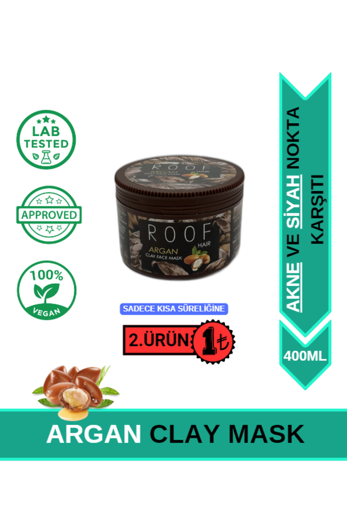 Roof Hair Argan yagli CLAY FACE MASK Argan yagi özlü kil maskesi cildinizi pürüzsüz ve ipeksi bir his kazandirir. Içerigindeki argan yaginin anti-aging özelligi sayesinde yasin ilerlemesi ve çevresel faktörlerden dolayi elastikiyetini kaybeden cildi sikilastirmaya özellikle ifade kirisikliginin görünümü azaltmaya yardimci olur. Akne ve siyah noktalari önlemede yardimci olur. Roof argan yagli kil maskesi ciltteki ölü tabakayi kaldirarak alt derinin oksijen almasina katki saglar.