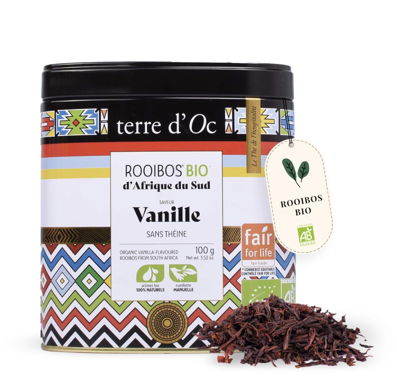 : Indulge in the perfect marriage of sweet rooibos and rich vanilla with this organic Vanilla Rooibos from Terre d'Oc. Ethically and organically harvested, this caffeine-free rooibos offers a naturally sweet and perfectly balanced infusion thanks to the addition of vanilla. Its comforting sweetness makes it an ideal choice for a break at any time of day. This product is cultivated according to fair trade principles, respecting both the environment and local producers. With its reusable metal tin, this tea also makes a perfect gift for tea lovers. Ingredients: rooibos (South Africa) 96 , natural vanilla flavoring . Organically grown ingredient. P.when('A').execute(function(A) { A.on('a:expander:toggle_description:toggle:collapse', function(data) { window.scroll(0, data.expander. expander[0].offsetTop-100) }) }) Instructions for use: store in a dry place. See moreTerre d'Oc, a committed brand: Passionate about authenticity and respect for traditions, Terre d'Oc offers natural and sustainable products for ethical and responsible consumption. A comforting infusion any time of day: Caffeine-free, this tea is ideal for a relaxing break, to be enjoyed anytime, thanks to its soothing sweetness and warm taste. Perfect for both hot and cold brewing. 100 Organic and Natural: This tea is organically grown, with no added flavorings, to guarantee a pure and high-quality product. Premium organic rooibos: Considered the national drink of South Africa, rooibos is prized for its rich flavor and health benefits. This organic rooibos is responsibly harvested and grown without pesticides, offering a naturally smooth and flavorful infusion. Delicious and natural vanilla: Ideally paired with the sweetness of vanilla, this rooibos reveals a smooth, fragrant, and naturally sweet flavor, without artificial flavorings. Presented in a pretty decorative and reusable box, ideal for enhancing your tasting ritual.Description du produit Laissez-vous séduire par le mariage parfait entre la douceur du rooibos et la richesse de la vanille avec ce Rooibos bio à la vanille de Terre d'Oc. Récolté de manière éthique et bio, ce rooibos sans théine offre une infusion naturellement sucrée et parfaitement équilibrée grâce à l'ajout de vanille. Sa douceur réconfortante en fait un choix idéal pour une pause à tout moment de la journée. Ce produit est cultivé selon des principes équitables, respectant à la fois l'environnement et les producteurs locaux. Avec sa boîte en métal réutilisable, ce thé est aussi un cadeau parfait pour les amateurs de thé. Ingrédients rooibos (Afrique du Sud) 96 , arôme naturel de vanille . Ingrédient issu de l'agriculture biologique. P.when('A').execute(function(A) { A.on('a:expander:toggle_description:toggle:collapse', function(data) { window.scroll(0, data.expander. expander[0].offsetTop-100) }) }) Mode d'emploi conserver dans un endroit sec Voir plusTerre d'Oc, une marque engagée : Passionnée par l'authenticité et le respect des traditions, Terre d'Oc propose des produits naturels et durables, pour une consommation éthique et responsable. Infusion réconfortante à tout moment de la journée : Sans théine, ce thé est idéal pour une pause détente, à savourer à tout moment, grâce à sa douceur apaisante et son goût chaleureux. Idéale en infusion à chaud comme à froid. 100 Bio et Naturel : Ce thé est issu de l'agriculture biologique, sans arômes ajoutés, pour garantir un produit pur et de qualité. Rooibos bio de qualité supérieure : Considéré comme la boisson nationale en Afrique du Sud, le rooibos est apprécié pour sa saveur gourmande et ses bienfaits. Ce rooibos bio est récolté de manière responsable et cultivé sans pesticides, offrant une infusion naturellement douce et savoureuse. Vanille gourmande et naturelle : idéalement associé à la douceur de la vanille, ce rooibos dévoile une saveur onctueuse, parfumée et naturellement sucrée, sans arômes artificiels. Présenté dans une jolie boîte décorative et réutilisable, idéale pour sublimer votre rituel de dégustation.Rooibos 100g VANILLE