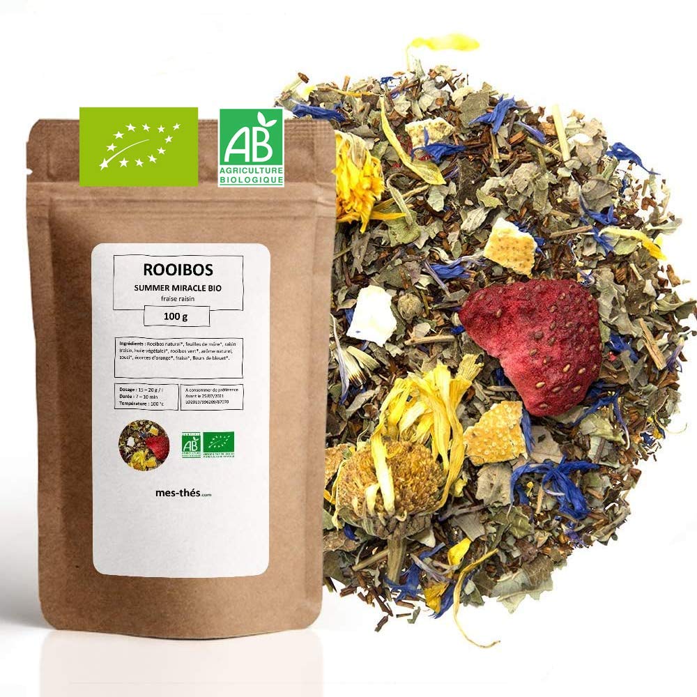 DIRECTIONS FOR USE: For a perfect infusion, use 15 to 20g of rooibos per liter of water, and let it steep for 7 to 10 minutes at 100 C. Enjoy it plain or personalize your drink by adding honey, lemon, or spices to your liking. CONVENIENT INSULATED PACKAGING: Available in 100g, 200g, and 1kg bags, Mes-Thés rooibos is packaged in resealable insulated bags. This packaging ensures optimal preservation of aroma and freshness, while also facilitating storage and daily use. SMOOTH INFUSION BENEFITS: Rooibos, often compared to a wellness herbal tea, is rich in antioxidants and known for its soothing and digestive properties. Its slightly sweet taste makes it a comforting drink, whether enjoyed hot or iced. CERTIFIED ORGANIC CAFFEINE-FREE: Grown using organic farming methods (FR-BIO-01), this rooibos is cultivated without pesticides or chemicals. Naturally caffeine-free, it's suitable for the whole family and can be enjoyed day or night, hot or cold. ORGANIC ROOIBOS - 100 NATURAL INFUSION: Discover this Organic Plain Rooibos, also known as red tea (caffeine-free). This mild and naturally sweet herbal tea is ideal for a caffeine-free infusion, to be enjoyed at any time of day.CONSEIL D'UTILISATION : Pour une infusion parfaite, utilisez 15 à 20 g de rooibos par litre d'eau, laissez infuser entre 7 et 10 minutes à une température de 100 C. Dégustez-le nature ou personnalisez votre boisson en ajoutant du miel, du citron ou des épices selon vos préférences. CONDITIONNEMENT ISOTHERME PRATIQUE : Proposé en sachets de 100g, 200g et 1kg, le rooibos Mes-Thés est conditionné dans des sachets isothermes refermables. Ce conditionnement assure une conservation optimale des arômes et de la fraîcheur, tout en facilitant le stockage et l'utilisation quotidienne. INFUSION DOUCE BIENFAITS : Le Rooibos, souvent comparé à une tisane bien-être, est riche en antioxydants et reconnu pour ses propriétés apaisantes et digestives. Son goût légèrement sucré en fait une boisson réconfortante, qu'elle soit consommée chaude ou glacée. CERTIFIÉ BIO SANS THÉINE : Issu de l'agriculture biologique (FR-BIO-01), le rooibos est cultivé sans pesticides ni produits chimiques. Naturellement sans théine, il convient à toute la famille et peut être consommé en journée comme en soirée, chaud ou froid. ROOIBOS BIO - INFUSION 100 NATURELLE : Découvrez ce Rooibos Nature Bio, également connu sous le nom de thé rouge (sans théine). Cette tisane douce et naturellement sucrée est idéale pour une infusion sans théine, à savourer à tout moment de la journée.Rooibos Bio Fraise raisin - 100g (40 tasses) - Thé en vrac 100 Agriculture Biologique - Mes-Thés