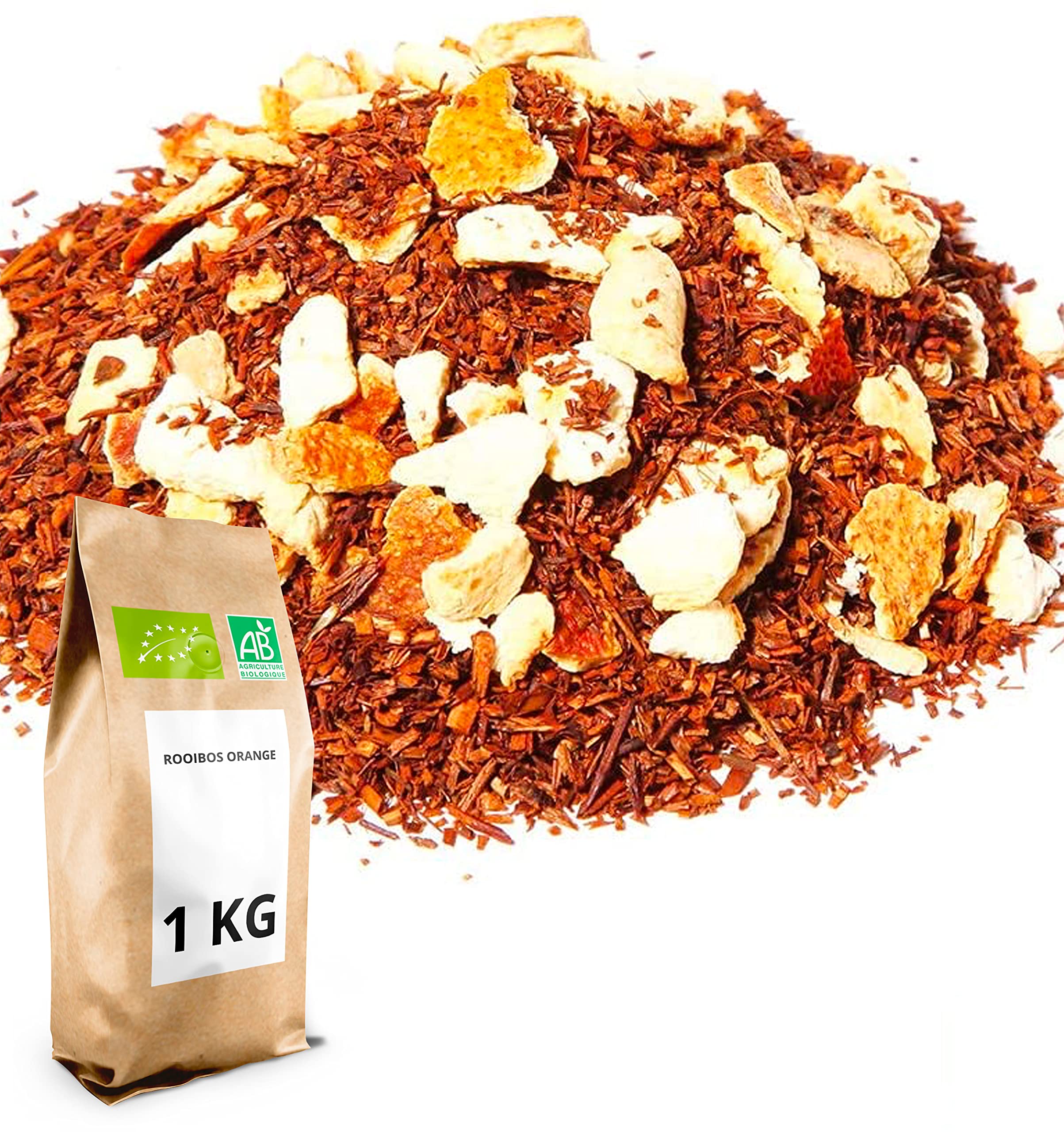 DIRECTIONS FOR USE: For a perfect infusion, use 15 to 20g of rooibos per liter of water, and let it steep for 7 to 10 minutes at 100 C. Enjoy it plain or personalize your drink by adding honey, lemon, or spices to your liking. CONVENIENT INSULATED PACKAGING: Available in 100g, 200g, and 1kg bags, Thés Direct rooibos is packaged in resealable insulated bags. This packaging ensures optimal preservation of aroma and freshness, while also facilitating storage and daily use. SMOOTH INFUSION BENEFITS: Rooibos, often compared to a wellness herbal tea, is rich in antioxidants and known for its soothing and digestive properties. Its slightly sweet taste makes it a comforting drink, whether enjoyed hot or iced. CERTIFIED ORGANIC CAFFEINE-FREE: Grown using organic farming methods (FR-BIO-01), this rooibos is cultivated without pesticides or chemicals. Naturally caffeine-free, it's suitable for the whole family and can be enjoyed day or night, hot or cold. ORGANIC ROOIBOS - 100 NATURAL INFUSION: Discover this Organic Plain Rooibos, also known as red tea (caffeine-free). This mild and naturally sweet herbal tea is ideal for a caffeine-free infusion, to be enjoyed at any time of day.CONSEIL D'UTILISATION : Pour une infusion parfaite, utilisez 15 à 20 g de rooibos par litre d'eau, laissez infuser entre 7 et 10 minutes à une température de 100 C. Dégustez-le nature ou personnalisez votre boisson en ajoutant du miel, du citron ou des épices selon vos préférences. CONDITIONNEMENT ISOTHERME PRATIQUE : Proposé en sachets de 100g, 200g et 1kg, le rooibos Thés Direct est conditionné dans des sachets isothermes refermables. Ce conditionnement assure une conservation optimale des arômes et de la fraîcheur, tout en facilitant le stockage et l'utilisation quotidienne. INFUSION DOUCE BIENFAITS : Le Rooibos, souvent comparé à une tisane bien-être, est riche en antioxydants et reconnu pour ses propriétés apaisantes et digestives. Son goût légèrement sucré en fait une boisson réconfortante, qu'elle soit consommée chaude ou glacée. CERTIFIÉ BIO SANS THÉINE : Issu de l'agriculture biologique (FR-BIO-01), le rooibos est cultivé sans pesticides ni produits chimiques. Naturellement sans théine, il convient à toute la famille et peut être consommé en journée comme en soirée, chaud ou froid. ROOIBOS BIO - INFUSION 100 NATURELLE : Découvrez ce Rooibos Nature Bio, également connu sous le nom de thé rouge (sans théine). Cette tisane douce et naturellement sucrée est idéale pour une infusion sans théine, à savourer à tout moment de la journée.Rooibos Bio Orange - 1 kg (400 tasses) - Thé en vrac 100 Agriculture Biologique - Thés Direct