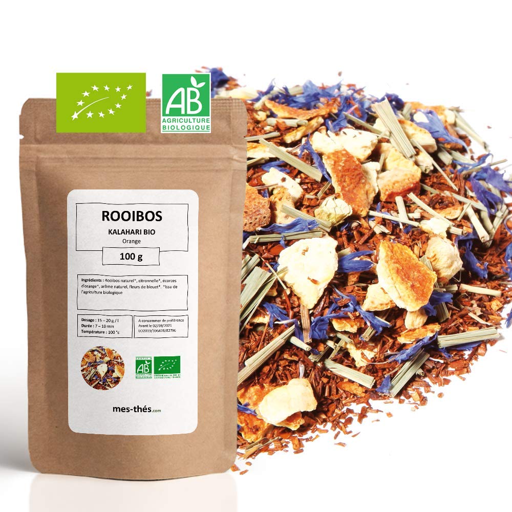 DIRECTIONS FOR USE: For a perfect infusion, use 15 to 20g of rooibos per liter of water, and let it steep for 7 to 10 minutes at 100 C. Enjoy it plain or personalize your drink by adding honey, lemon, or spices to your liking. CONVENIENT INSULATED PACKAGING: Available in 100g, 200g, and 1kg bags, Mes-Thés rooibos is packaged in resealable insulated bags. This packaging ensures optimal preservation of aroma and freshness, while also facilitating storage and daily use. SMOOTH INFUSION BENEFITS: Rooibos, often compared to a wellness herbal tea, is rich in antioxidants and known for its soothing and digestive properties. Its slightly sweet taste makes it a comforting drink, whether enjoyed hot or iced. CERTIFIED ORGANIC CAFFEINE-FREE: Grown using organic farming methods (FR-BIO-01), this rooibos is cultivated without pesticides or chemicals. Naturally caffeine-free, it's suitable for the whole family and can be enjoyed day or night, hot or cold. ORGANIC ROOIBOS - 100 NATURAL INFUSION: Discover this organic rooibos, also known as red tea (caffeine-free). This mild and naturally sweet herbal tea is ideal for a caffeine-free infusion, to be enjoyed at any time of day.CONSEIL D'UTILISATION : Pour une infusion parfaite, utilisez 15 à 20 g de rooibos par litre d'eau, laissez infuser entre 7 et 10 minutes à une température de 100 C. Dégustez-le nature ou personnalisez votre boisson en ajoutant du miel, du citron ou des épices selon vos préférences. CONDITIONNEMENT ISOTHERME PRATIQUE : Proposé en sachets de 100g, 200g et 1kg, le rooibos Mes-Thés est conditionné dans des sachets isothermes refermables. Ce conditionnement assure une conservation optimale des arômes et de la fraîcheur, tout en facilitant le stockage et l'utilisation quotidienne. INFUSION DOUCE BIENFAITS : Le Rooibos, souvent comparé à une tisane bien-être, est riche en antioxydants et reconnu pour ses propriétés apaisantes et digestives. Son goût légèrement sucré en fait une boisson réconfortante, qu'elle soit consommée chaude ou glacée. CERTIFIÉ BIO SANS THÉINE : Issu de l'agriculture biologique (FR-BIO-01), le rooibos est cultivé sans pesticides ni produits chimiques. Naturellement sans théine, il convient à toute la famille et peut être consommé en journée comme en soirée, chaud ou froid. ROOIBOS BIO - INFUSION 100 NATURELLE : Découvrez ce Rooibos Bio, également connu sous le nom de thé rouge (sans théine). Cette tisane douce et naturellement sucrée est idéale pour une infusion sans théine, à savourer à tout moment de la journée.Rooibos Bio Orange Kalahari - 100g (40 tasses) - Thé en vrac 100 Agriculture Biologique - Mes-Thés
