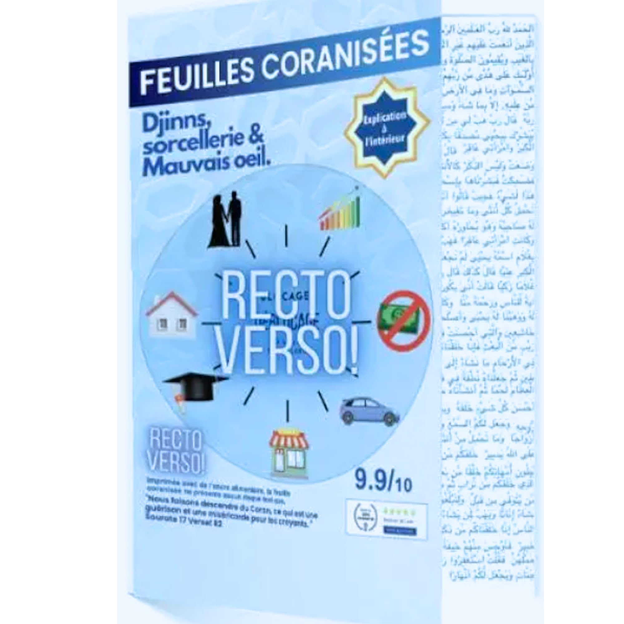 "We send down of the Quran that which is healing and mercy for the believers." Surah 17, verse 82. This Quranic-infused sheet allows you to prepare Quranic-infused water, which you can use to: shower, drink, make herbal teas, spray your home, shop, or car, and drink. Prevention against occult problems: First, dilute the Quranic sheet with 18 bottles of 1.5 liters of water. Empty all the bottles soak the Quranic sheet in the water for 1 hour and 30 minutes, then wring it out and return the water to the bottles. Wash yourself each evening with one 1.5-liter bottle. Pour it over your head and body (warm it beforehand). Collect the water in a b and dispose of it in nature, saying "Bismillah" beforehand. You must wash yourself for 12 consecutive days.Food-grade ink, safe for the body. May Allah make it easy for you. To deactivate talismans, place the Quranic verse in a b, then open the talisman or spell. Let the Quranic verse water deactivate the magic (sihr) for 24 hours. Empty the water into nature, dry it, and burn the spell or talisman after allowing it to dry completely. This is a 12-day treatment. In case of frequent problems at work or frequent arguments at home, take Quranic verse water and sprinkle it by hand or with a spray bottle: walls, ceilings, floors, behind furniture, and the outside of windows and doors. Say "Bismillah" each time or play a Quran CD while you sprinkle. Prevention against occult problems: First, dilute the Quranic verse with 18 1.5-liter bottles of water. Empty all the bottles. Soak the Quranic verse in water for 1 hour and 30 minutes, then wring it out and return the water to the bottles. Wash yourself every evening with one 1.5-liter bottle. Pour it over your head and body (warm the water beforehand). Collect the water in a b and dispose of it in nature, saying "Bismillah" before doing so.5 Feuilles coranisées diluables Roqya Mauvais oeil Djinn Sorcellerie Diable Chitane Désactivation de talisman Sounna Coran Contre Sihr Blocage CauchemarsDESCRIPTION DU PRODUIT "Nous faisons descendre du Coran, ce qui est une guérison et une miséricorde pour les croyants."Sourate 17 verset 82 Cette feuille coranisée vous permet de préparer de l'eau coranisée, et vous pouvez avec cette eau : vous doucher,boire, prendre des tisanes, vaporiser la maison-boutique-voiture, boire. Prévention contre problèmes occultes Vous allez d'abord diluer la feuille de Coran avec 18 bouteilles d'eau de 1,5 litre. Il faut vider toutes les bouteilles laisser tremper la feuille de Coran dans l'eau pendant 1h30, puis l'essorer et remettre l'eau dans les bouteilles. Lavez-vous chaque soir avec 1 bouteille de 1,5 litre. Videz la sur la tête et le corps (chauffer au préalable ). Récupérez l'eau dans une bassine et jetez là dans la nature, avant de jeter dire bismillah. Vous devez vous lavez pendant 12 jours consécutifs.Encre alimentaire sans risque pour le corps. Qu'Allah vous facilite. Pour désactiver les talismans, mettre la feuille coranisée dans une bassine, ensuite ouvrir le talisman ou sorcellerie, laisser pendant 24h l'eau coranisée désactiver le sihr, vider l'eau dans la nature, sécher et bruler la sorcellerie, talisman, après l'avoir laissé sécher. Cure de 12 jours. en cas de problèmes fréquents sur les lieux de travail, ou de disputes fréquentes à la maison, prendre de l'eau coranisée et asperger à la main ou avec un vaporisateur : murs, plafonds, sols, derrière les meubles, extérieur des fenêtres et portes. Dites : "Bismillah" à chaque fois ou mettez un CD de Coran pendant que vous aspergez. Prévention contre problèmes occultes Vous allez d'abord diluer la feuille de Coran avec 18 bouteilles d'eau de 1,5 litre. Il faut vider toutes les bouteilles laisser tremper la feuille de Coran dans l'eau pendant 1h30, puis l'essorer et remettre l'eau dans les bouteilles. Lavez-vous chaque soir avec 1 bouteille de 1,5 litre. Videz la sur la tête et le corps (chauffer au préalable ). Récupérez l'eau dans une bassine et jetez là dans la nature, avant de jeter dire bismillah.