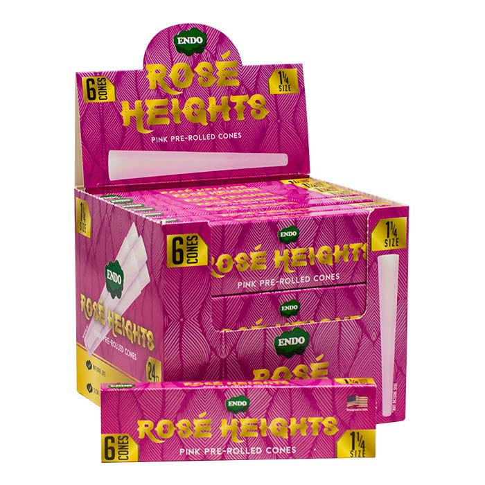 Rosé Heights 1.25 Size Pink Pre-Rolled Cones Display of 24 Each box has 6 Pre-Rolled cones Use with legal herbs only Not for tobacco use Natural Dye, Slow Burning Ultra Thin and GMO-Free Size color may vary due to hand-made